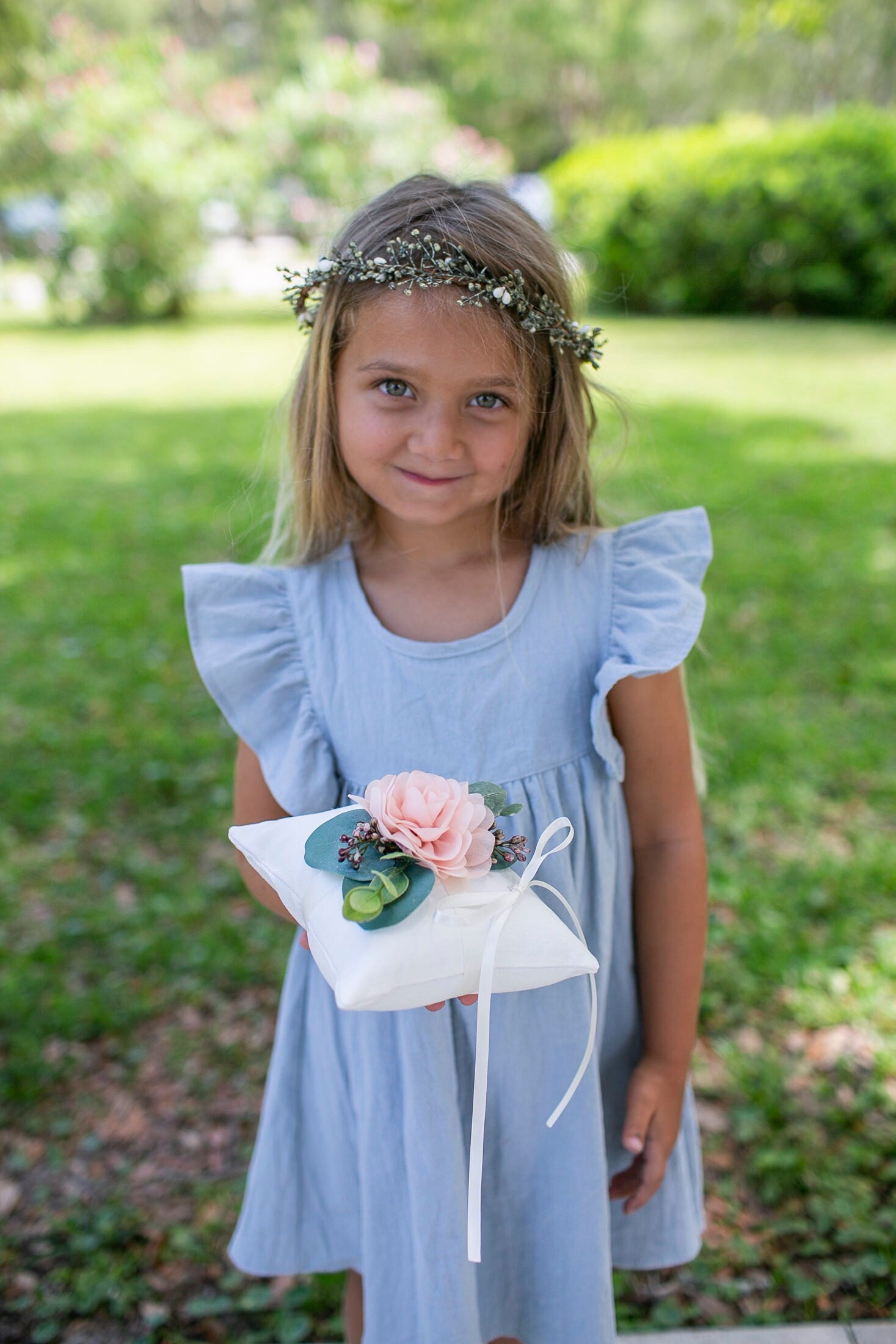 Our Adeline ring bearer pillow is inspired by blush garden weddings and timeless, blush color palettes. The linen-look pillow suits a variety of wedding styles and is accented with faux eucalyptus and a handmade chiffon rose. Ivory satin ribbon is added to hold the rings in place.
