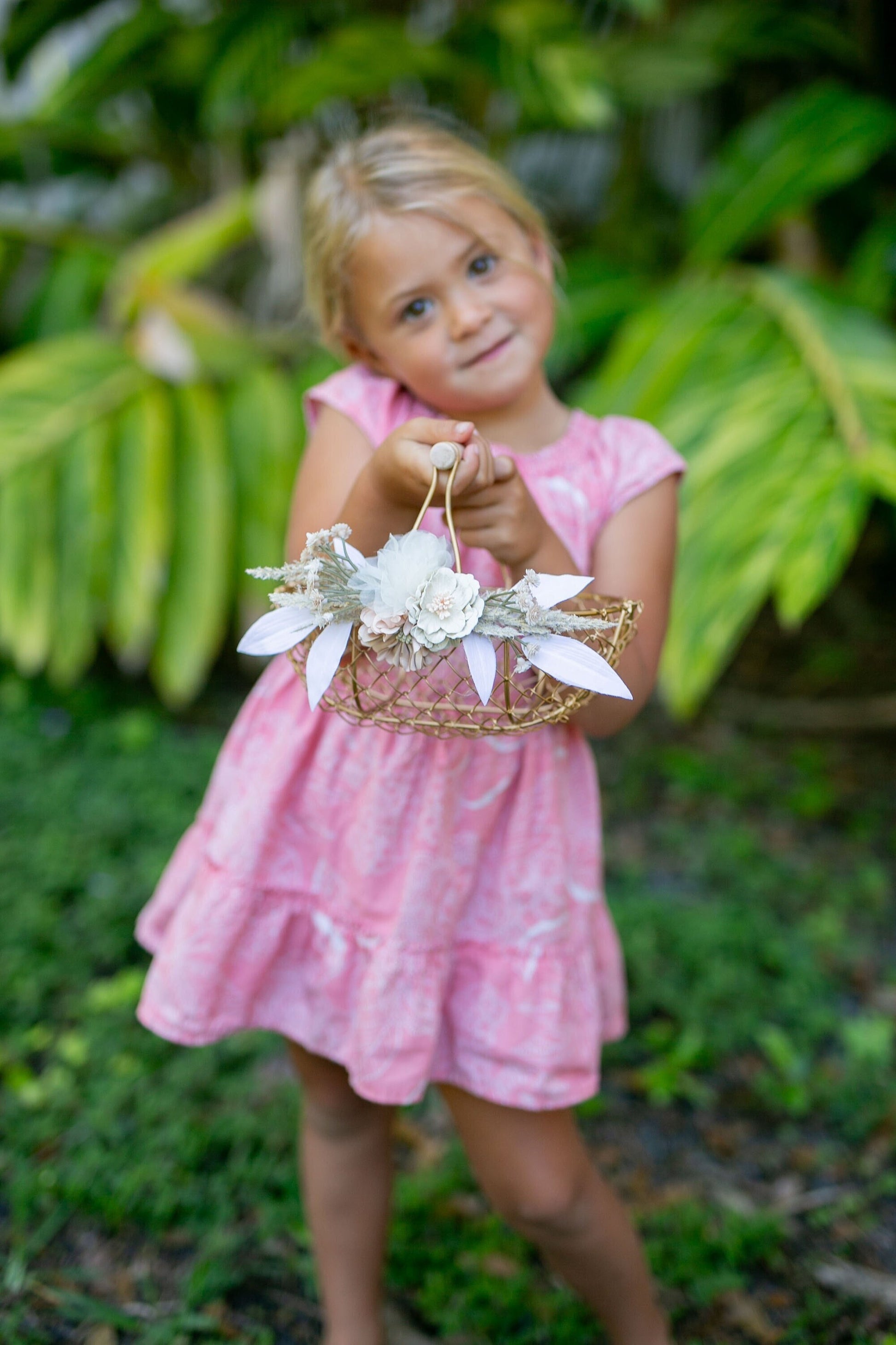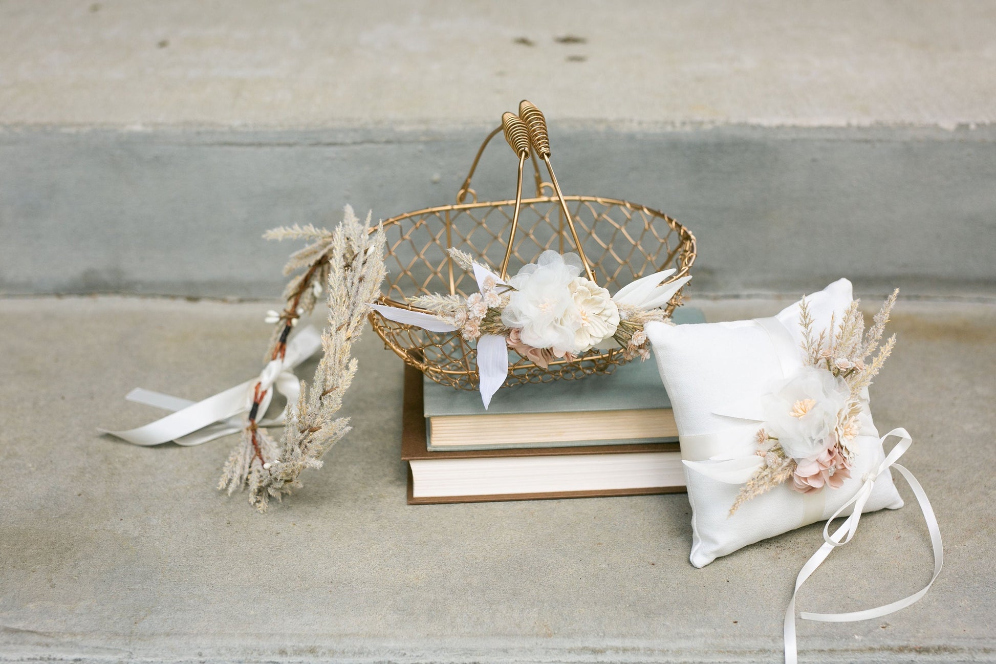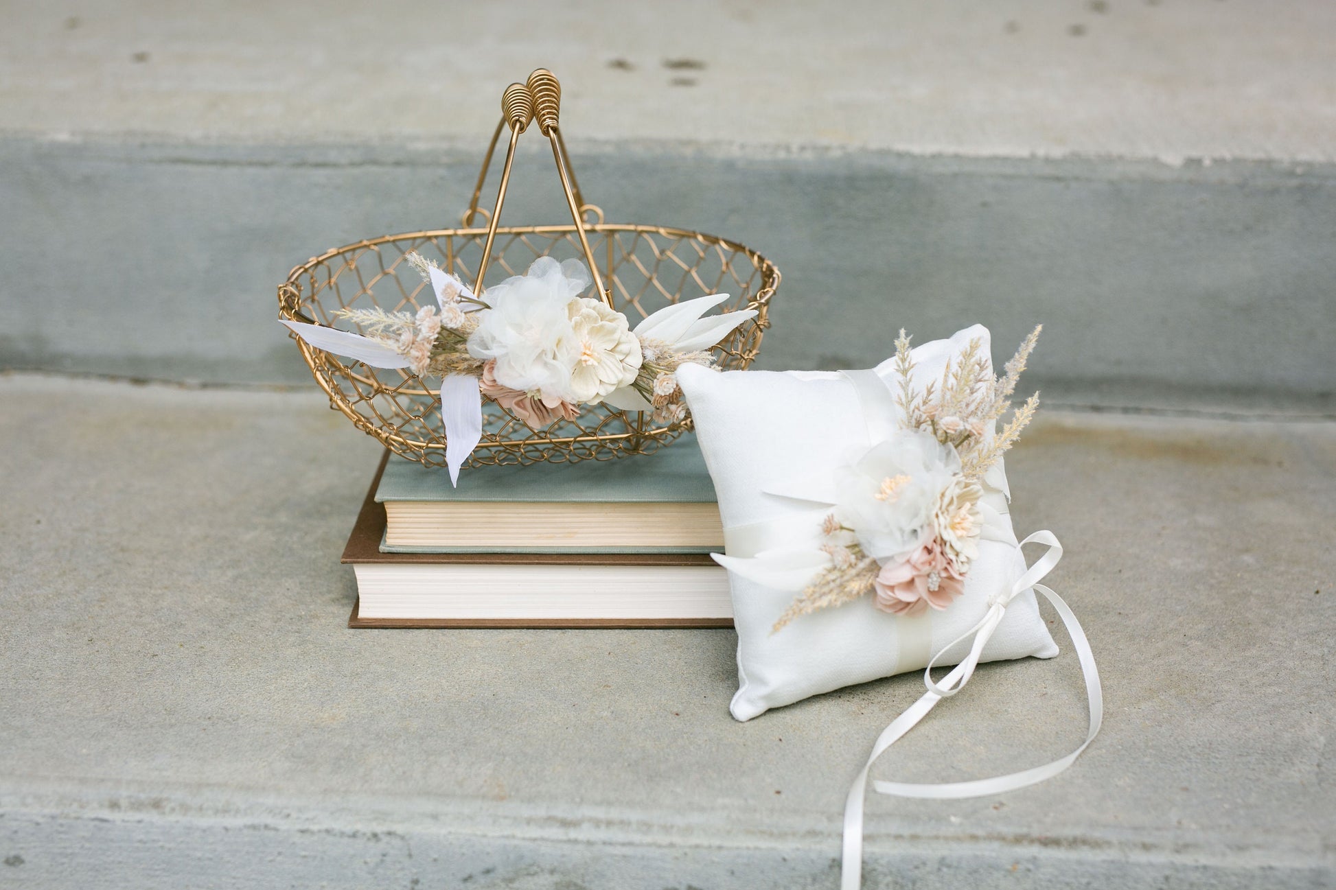 A desert-inspired, bohemian flower girl basket & matching accessories. 'Fleur' features neutral clusters of artificial blooms and grassy accents that easily pair with your wedding floral arrangements. She's easy to carry & perfectly sized for flower girls of all ages. An optional ring bearer pillow is designed to match. Pair with our whimsical bohemian crown for a complete look.