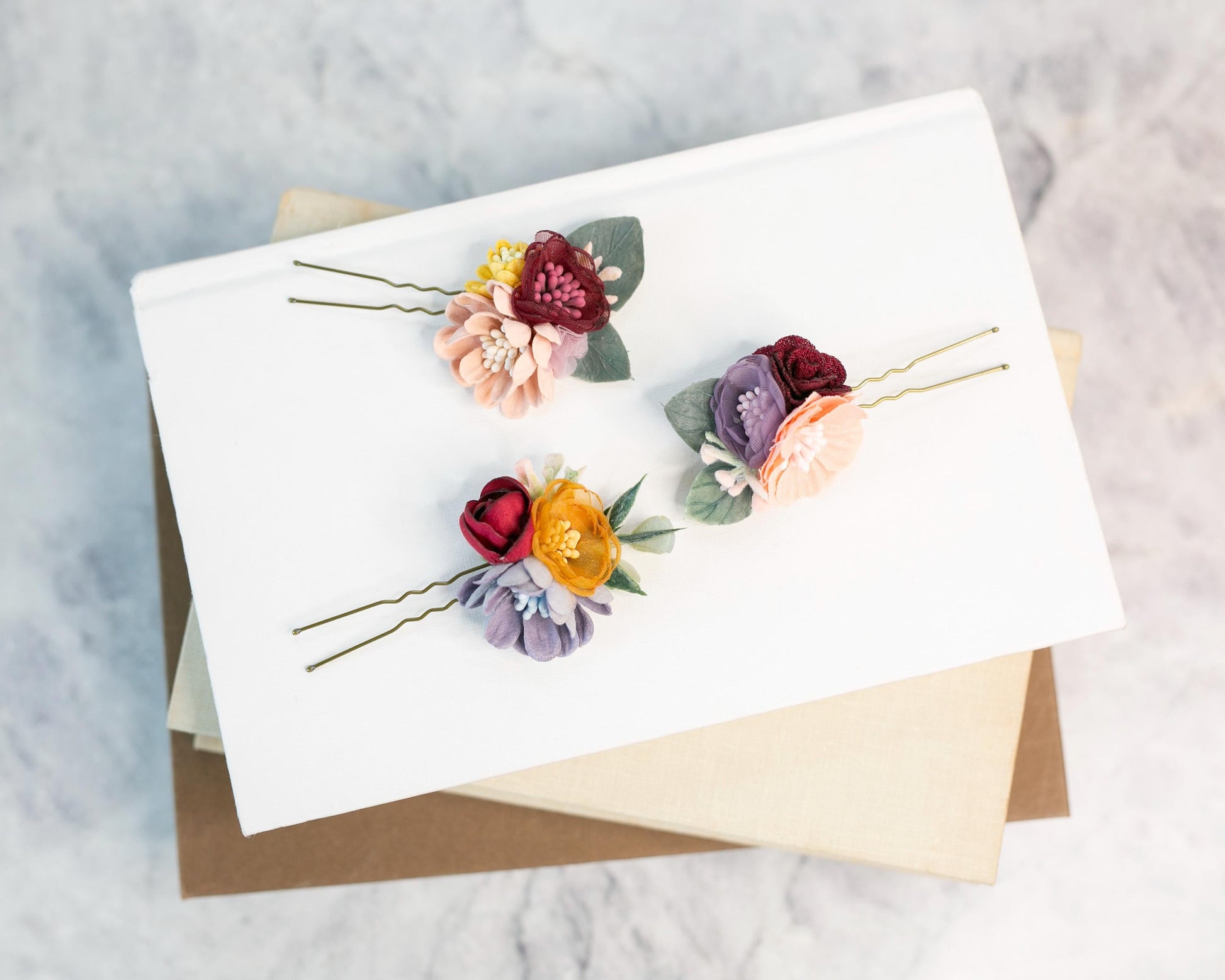 A mix & match colorful set of handcrafted bridal hairpins featuring: - Mini Fabric flowers and artificial greenery details - Brass Color Hair Pin Use together to create a one-of-a-kind bridal hairpiece OR use throughout a cascading hairstyle to create a beautiful, bohemian effect.