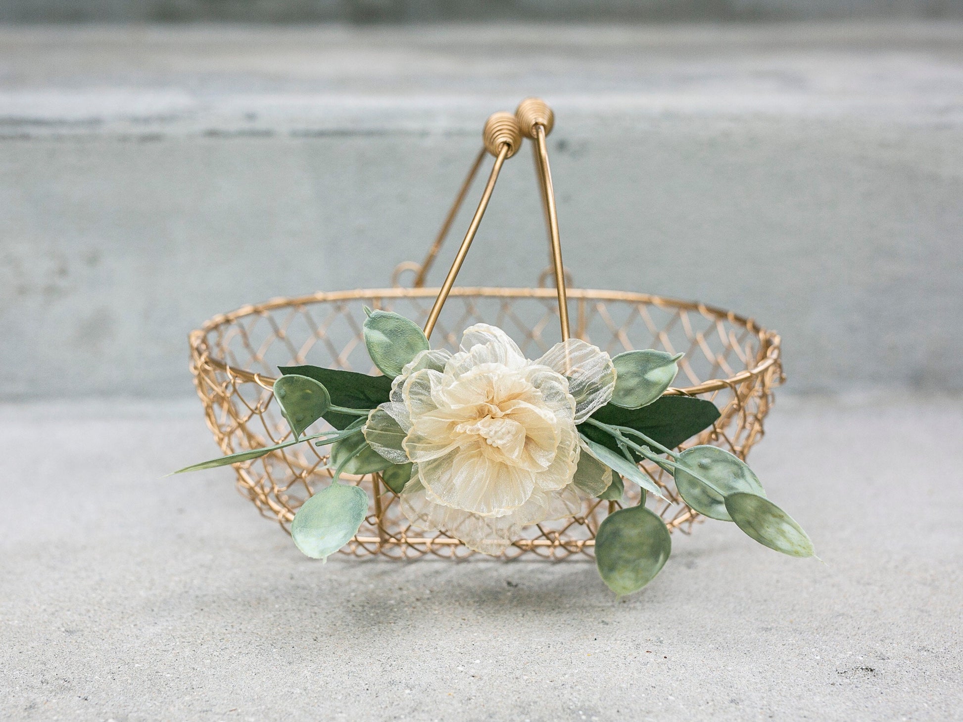 A little bit sweet and a little bit glam! Amber features a warm champagne gold basket with a slightly matte finish. She's decorated with layered artificial eucalyptus and handmade organza rose.