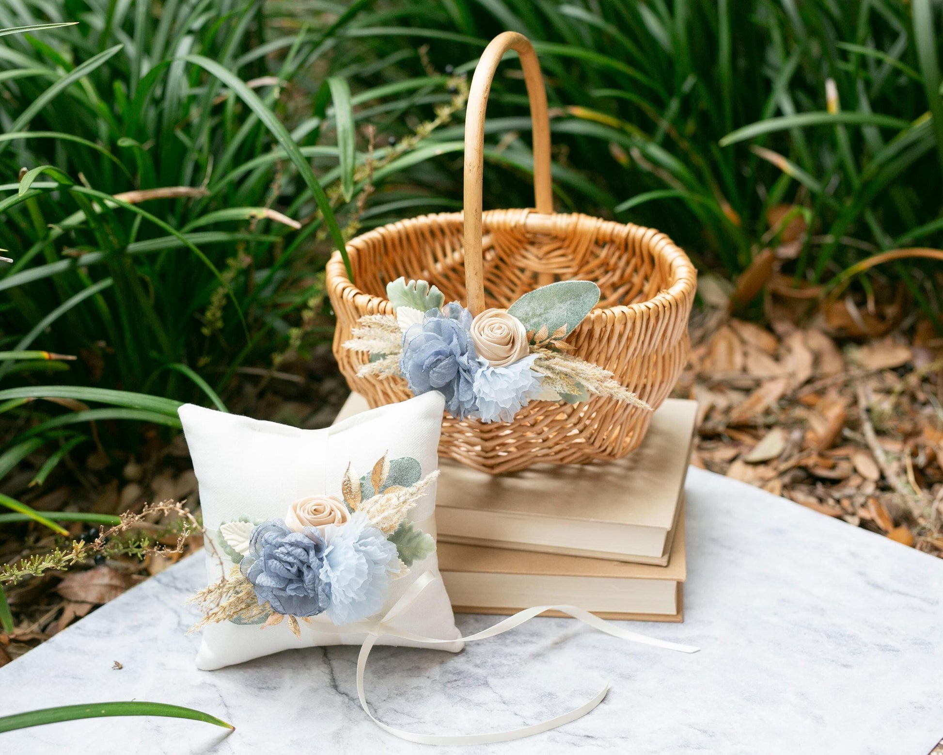 Coastal Flower Girl Basket & Ring Pillow Set: Boho Baby Blue Accents