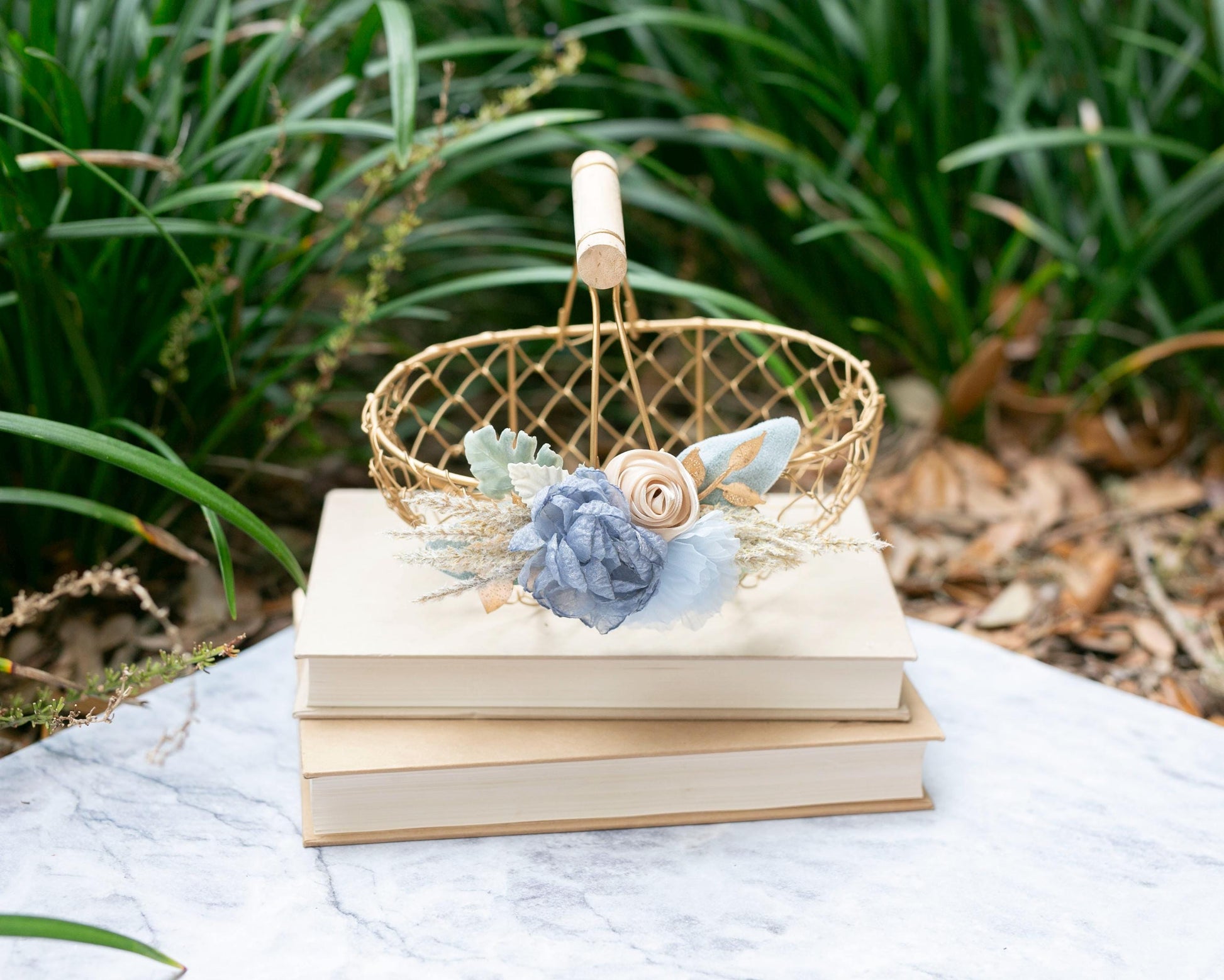 A coastal-inspired, bohemian flower girl basket with the option of a matching ring bearer pillow. 'Skye' features light blue and golden accents for the perfect coastal granddaughter aesthetic. These aqua tones can also be the perfect touch of 'something blue.' She's easy to carry & perfectly sized for flower girls of all ages.
