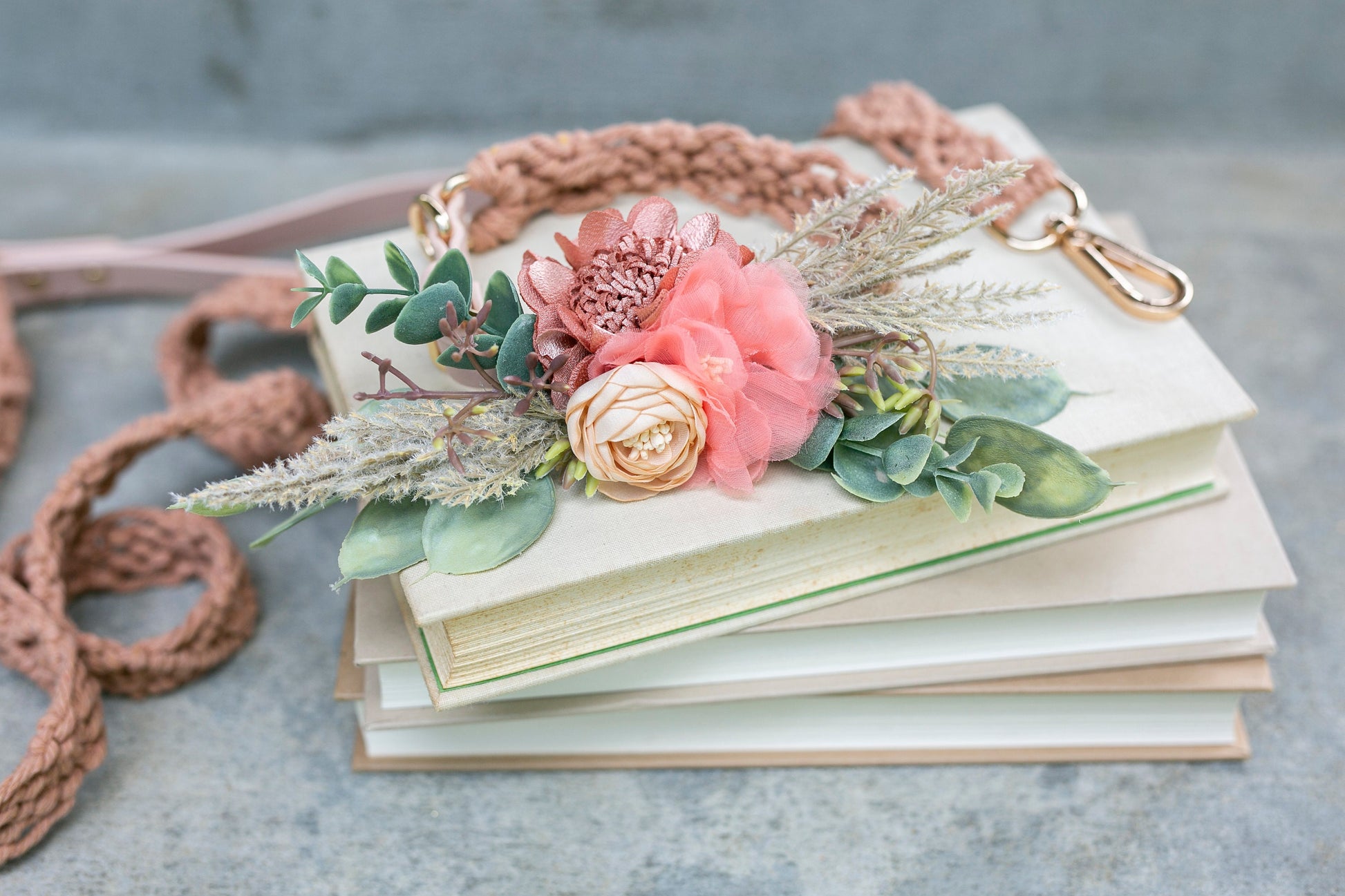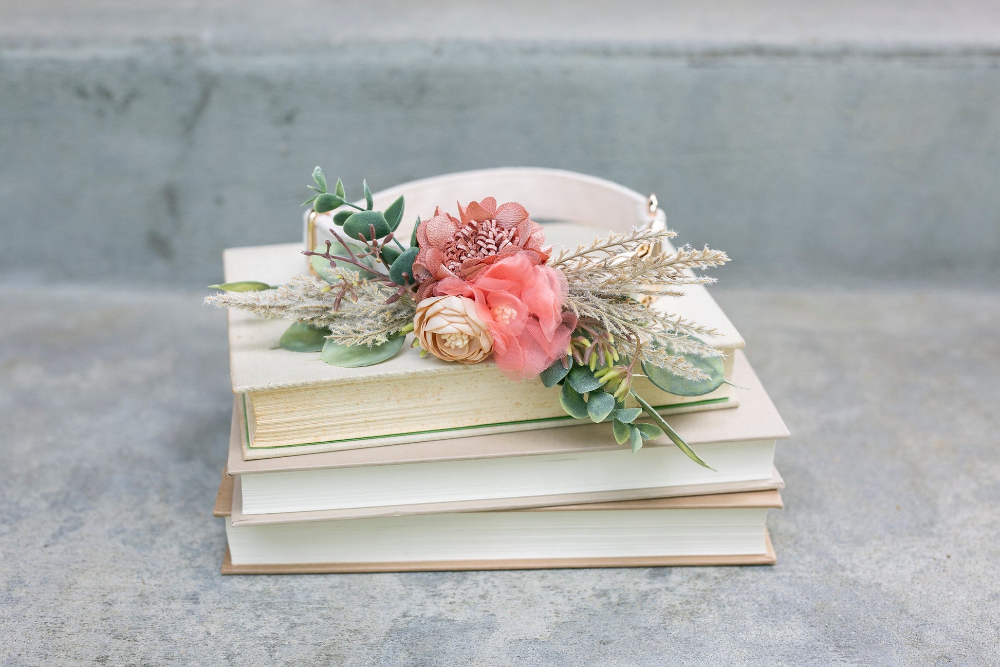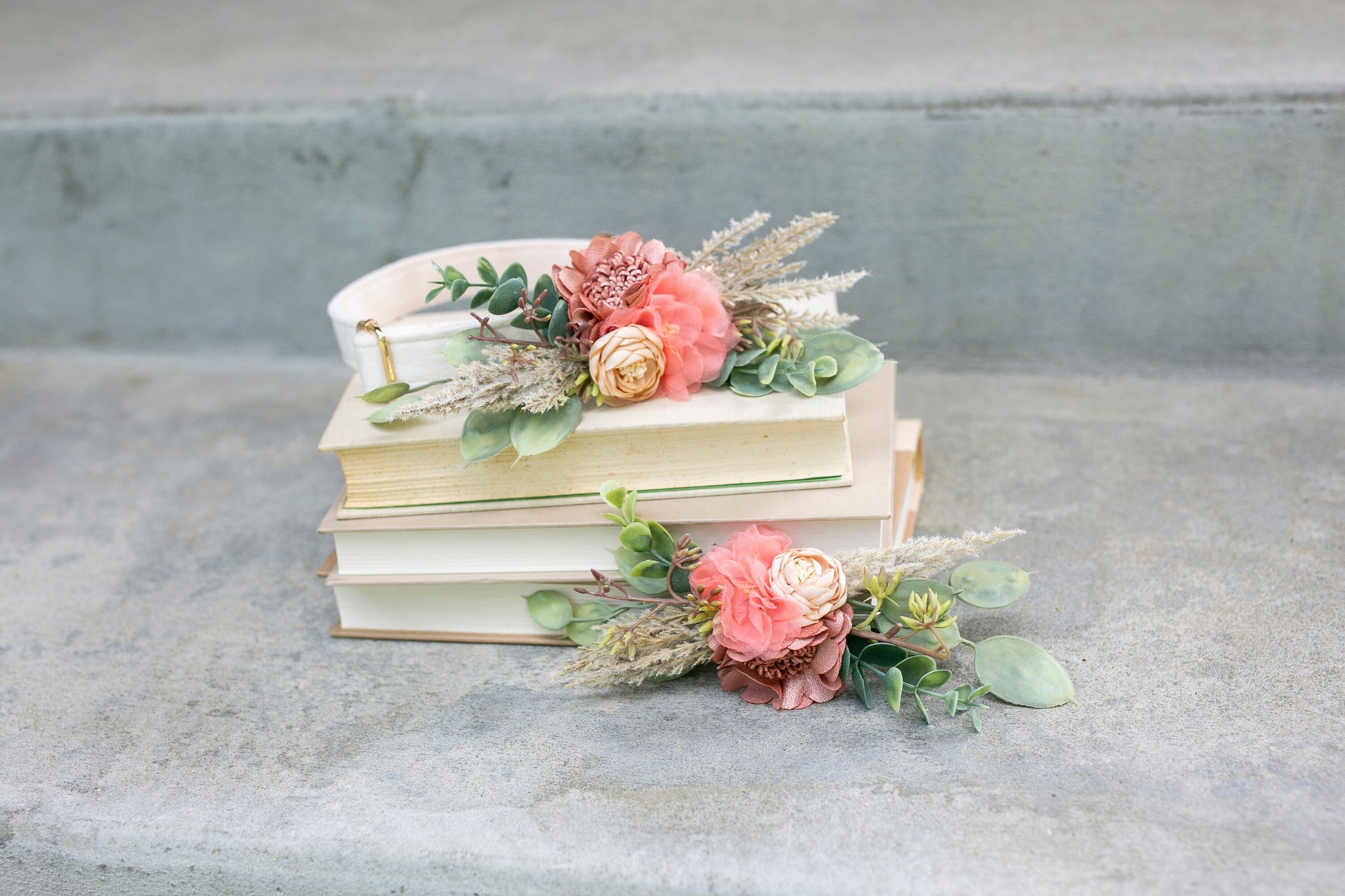 ♥ AMELIA PET COLLAR CORSAGE 'Amelia' is an attachable collar/leash corsage that combines terracotta and coral toned fabric wildflower details and layered faux greenery for a cheerful presentation on your dog's collar. Perfect for including your dog in your wedding party! Designed on a soft felt back and velcro attachment that can be added to any leash/collar.