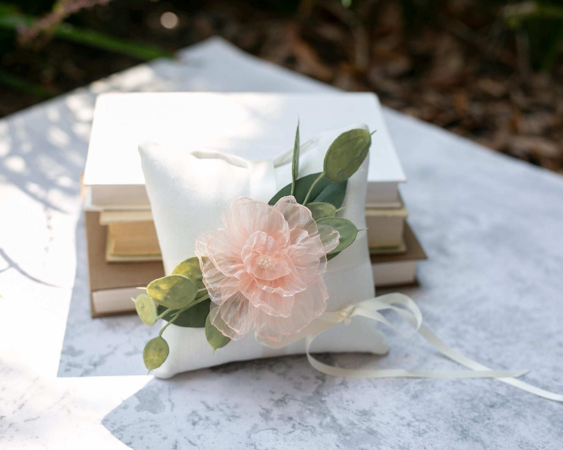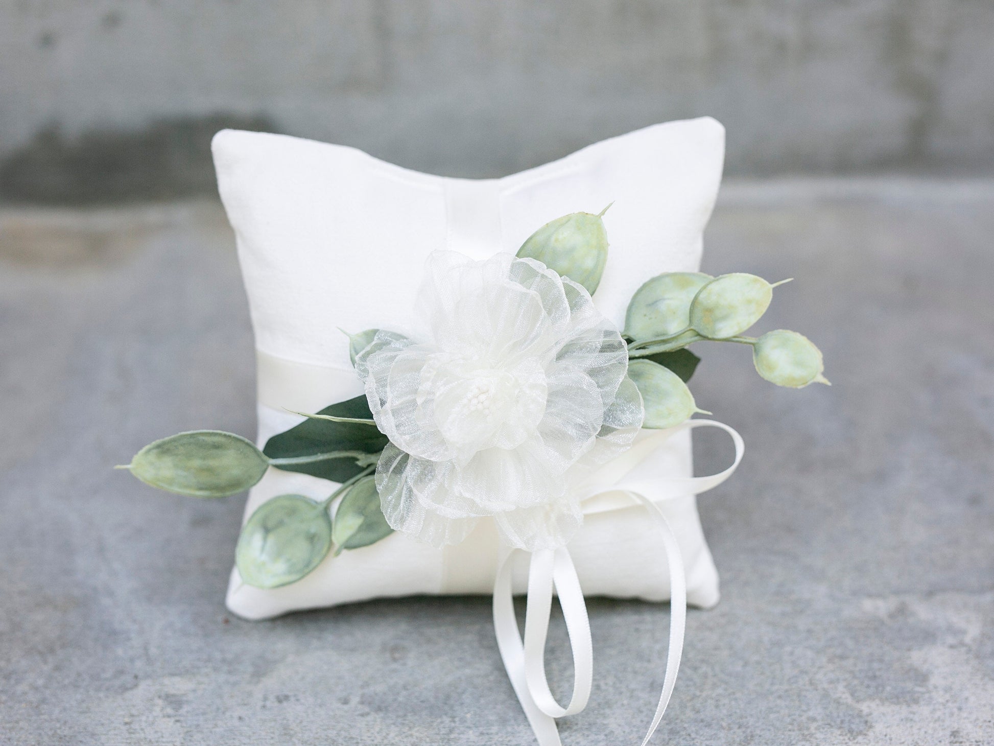 This handmade ring bearer pillow is decorated with cascading artificial eucalyptus. An organza flower in soft bridal white, pale champagne gold, mint, bronze or pink adds a sweet floral accent that perfectly complements the linen-look pillow and a variety of bridal bouquet styles.