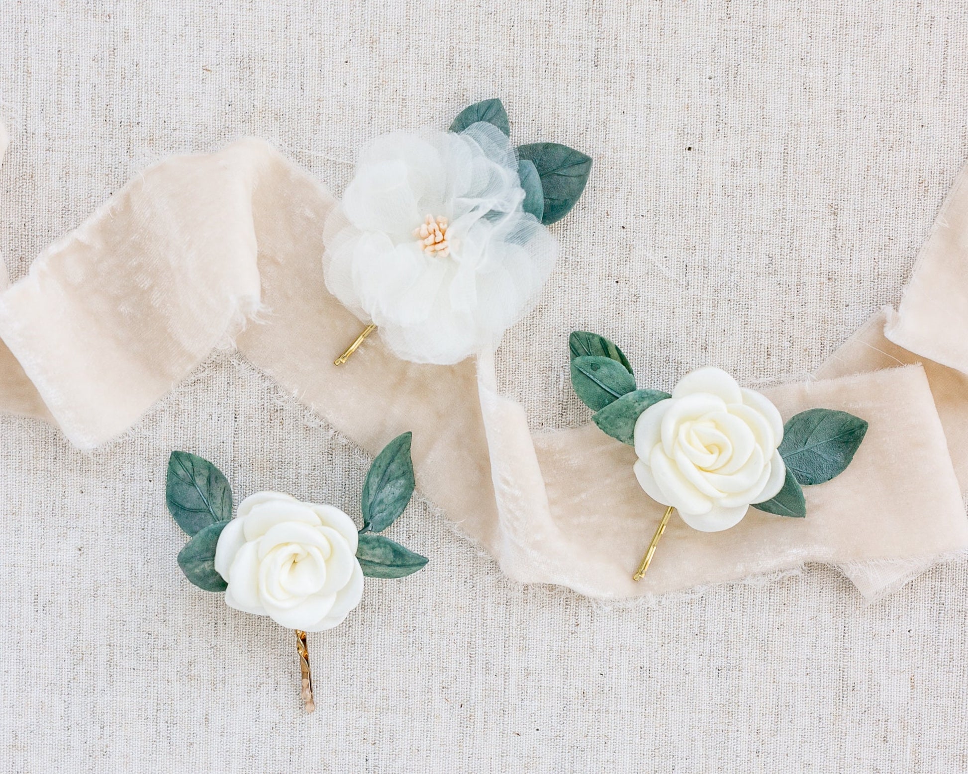 •Gold bobby pin base for easy styling • Flower size – silk organza: 2-2.5" | petite satin roses: 1-1.5"