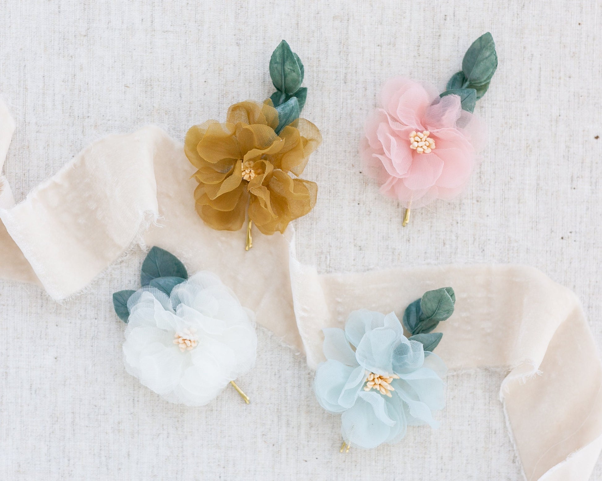 A mix and match set of handcrafted bridal or flower girl hairpins featuring artificial eucalyptus and handmade satin and organza fabric flowers. Customize your look with our curated color selection of organza wildflowers. Choose your color, and we'll send you a mix and match set with your selection plus ivory satin roses. Use together to create a one-of-a-kind bridal hairpiece OR use throughout a cascading hairstyle to create a beautiful, bohemian effect.