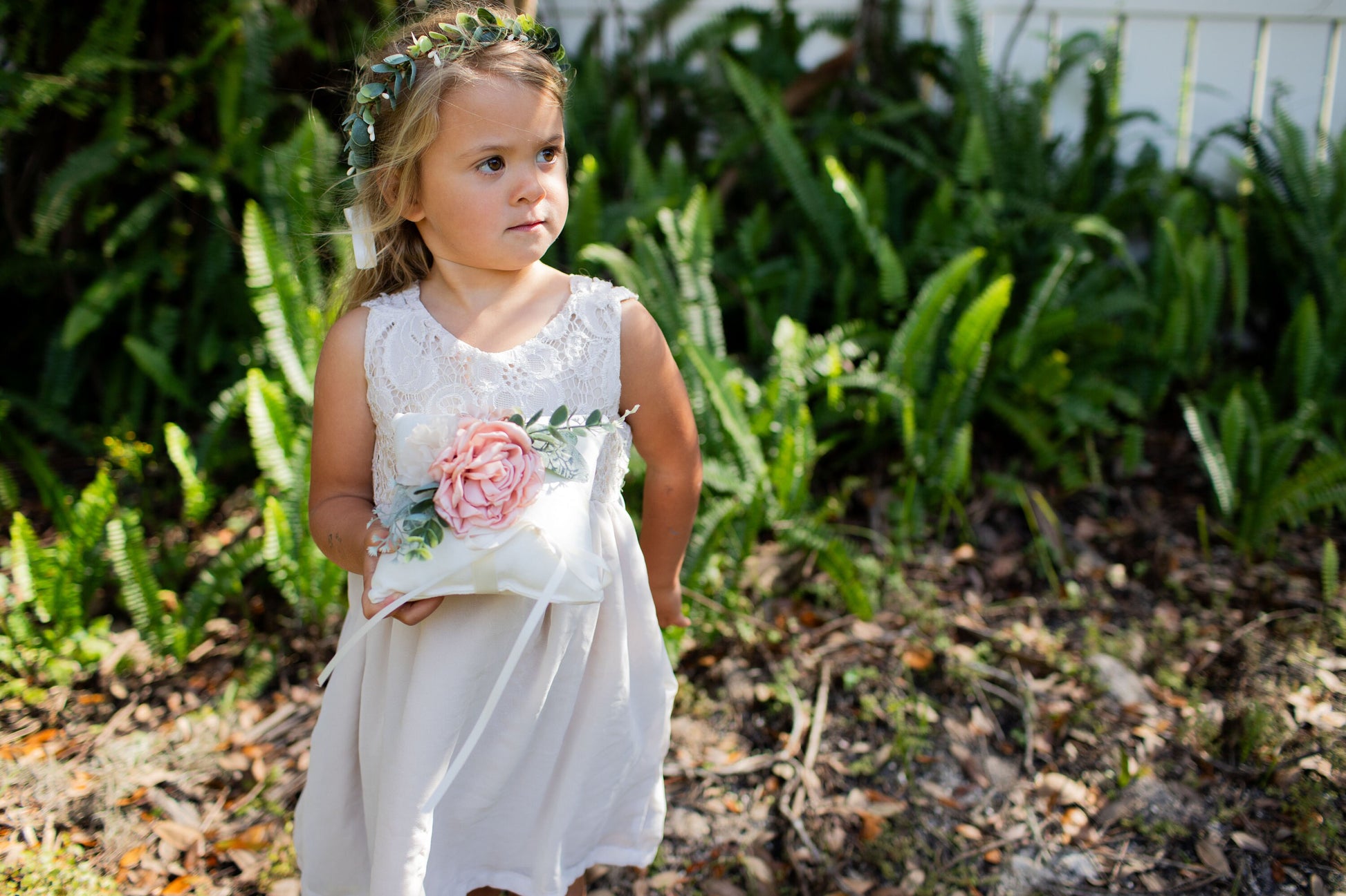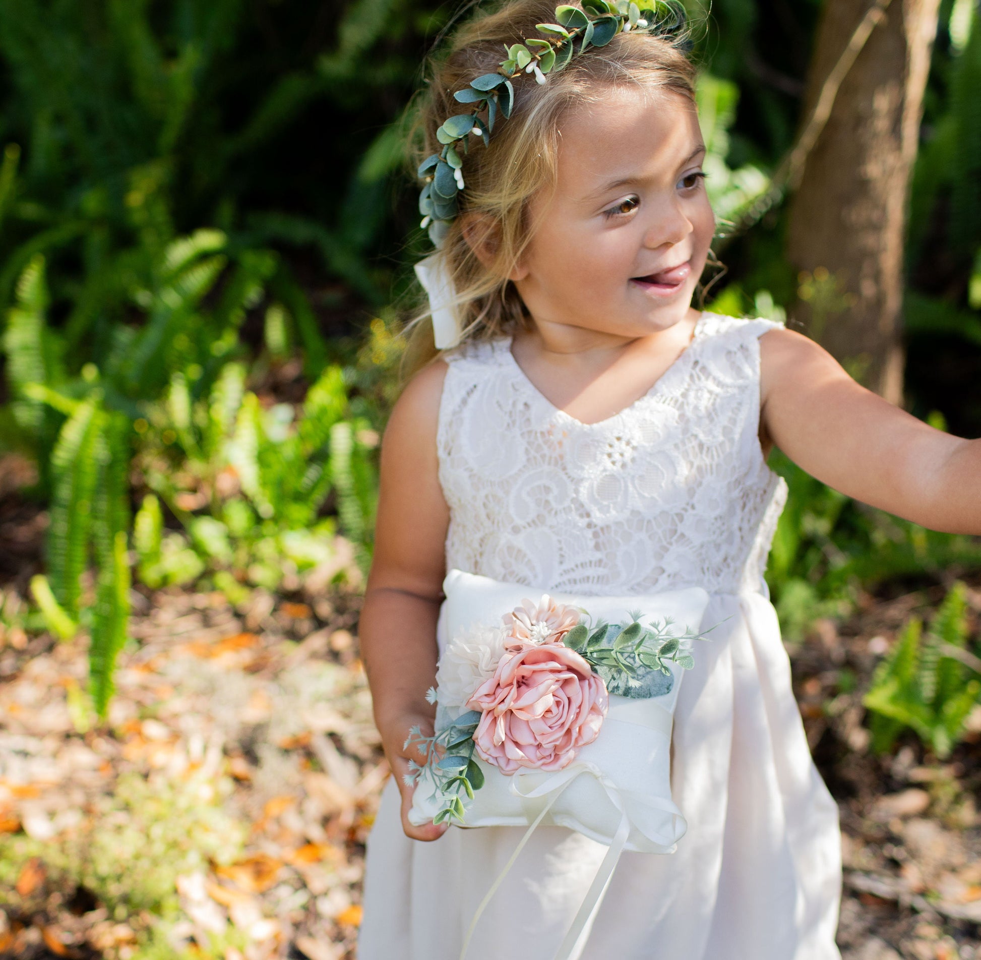 MEET KAI - A girly ring bearer pillow inspired by destination weddings, our Kai ring pillow features lush ivory and blush floral details with eucalyptus greenery, creating a cheerful and elegant presentation for your rings.