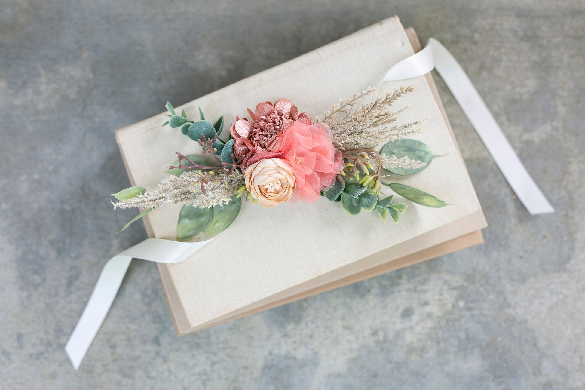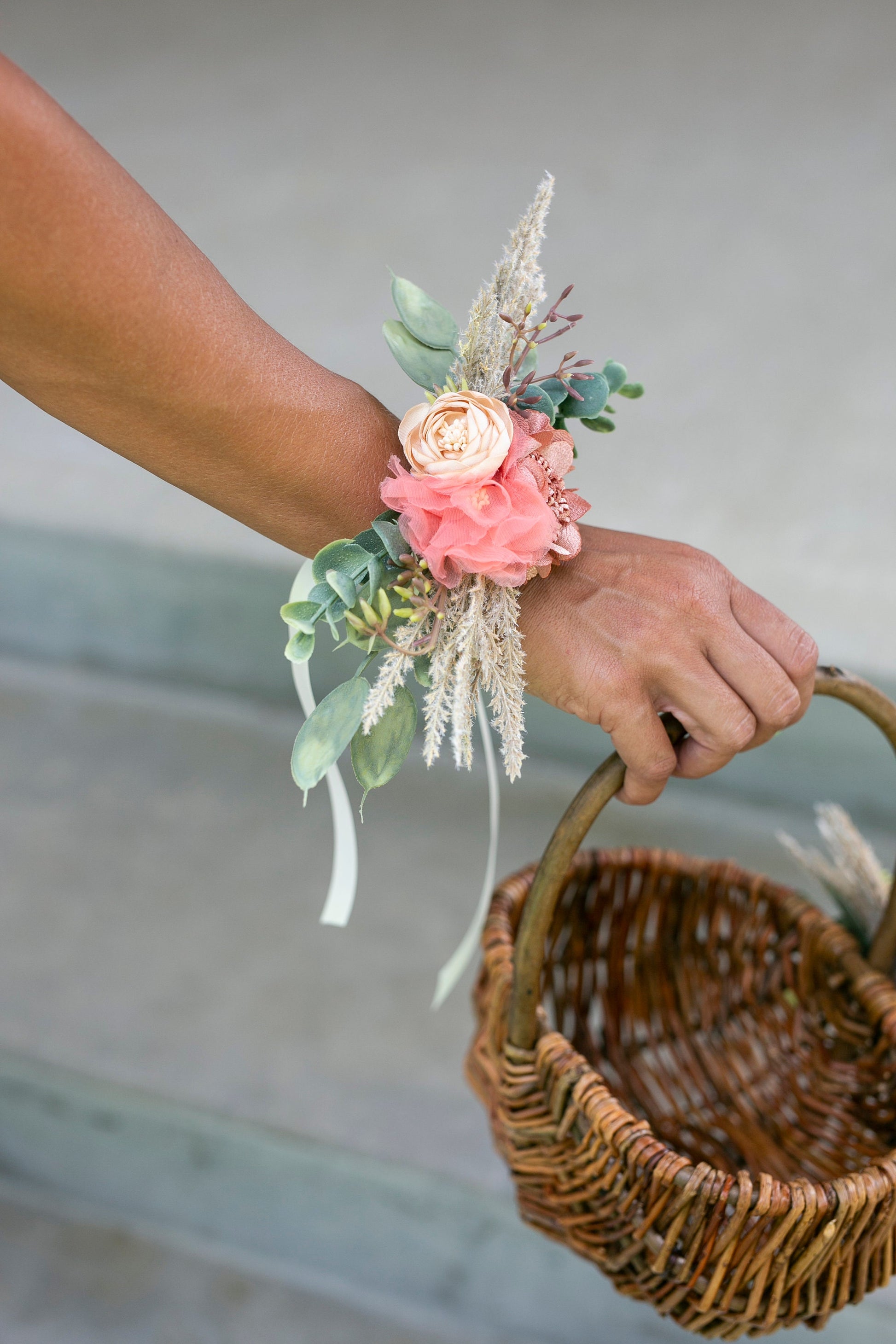 ♥ MEET FRANCESCA We haven't forgotten the rest of your honored guests! Soft Eucalyptus and artificial pampas grass layered with a cluster of fabric wildflowers and desert blooms – a durable accessory for flower girls of all sizes!
