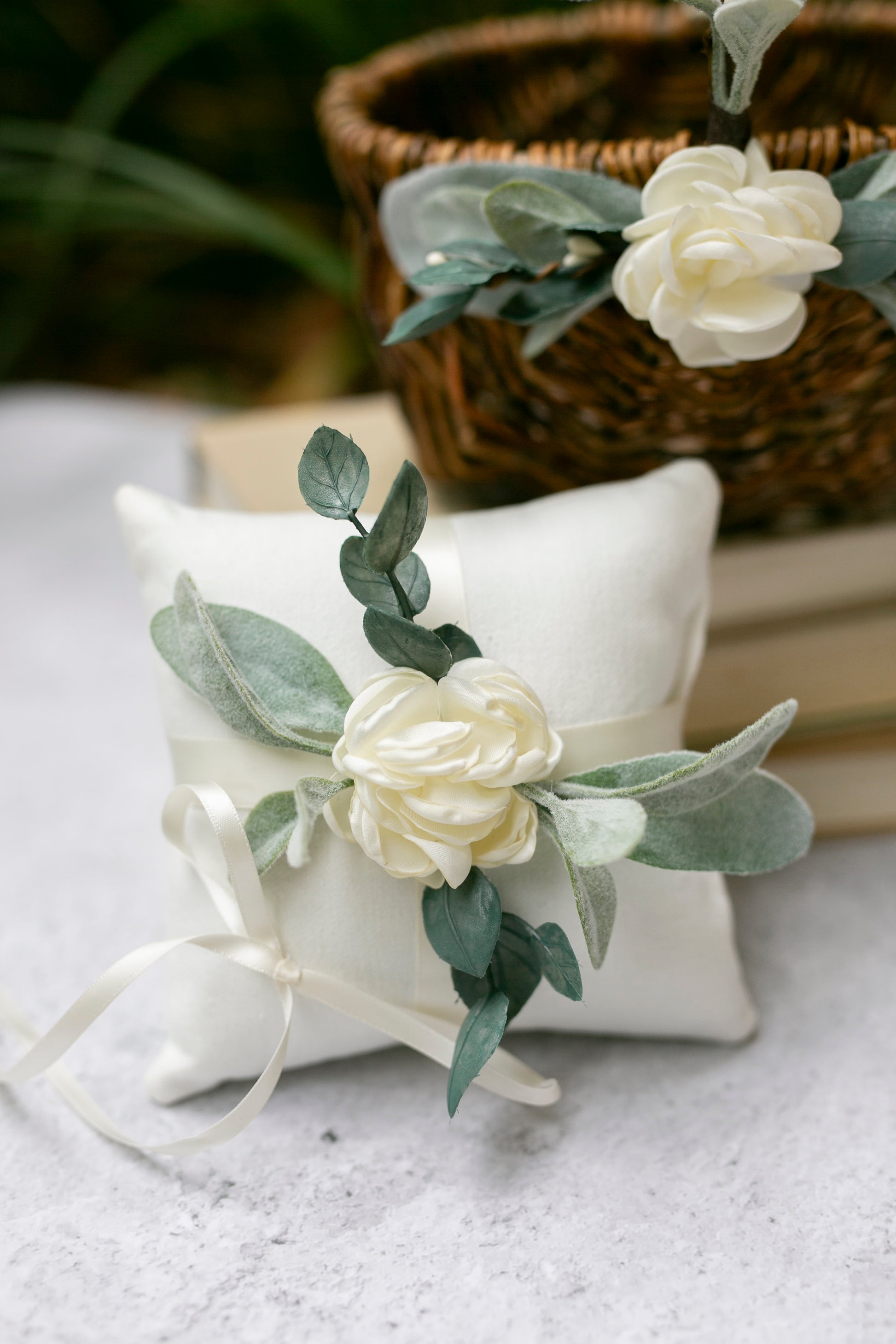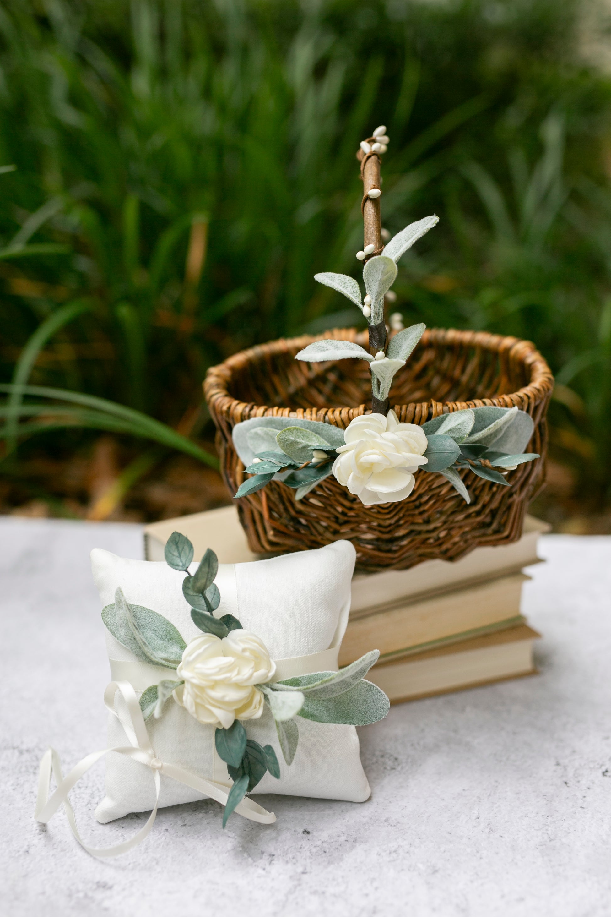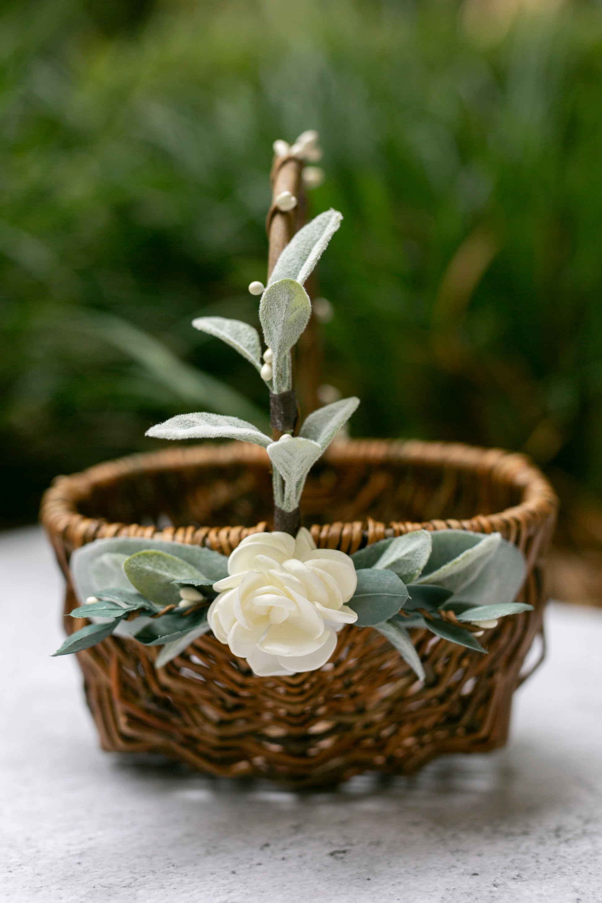 Grace features romantic greenery & soft ivory accents that easily pair with your wedding floral arrangements. Easy to carry & perfectly sized for flower girls of all ages.
