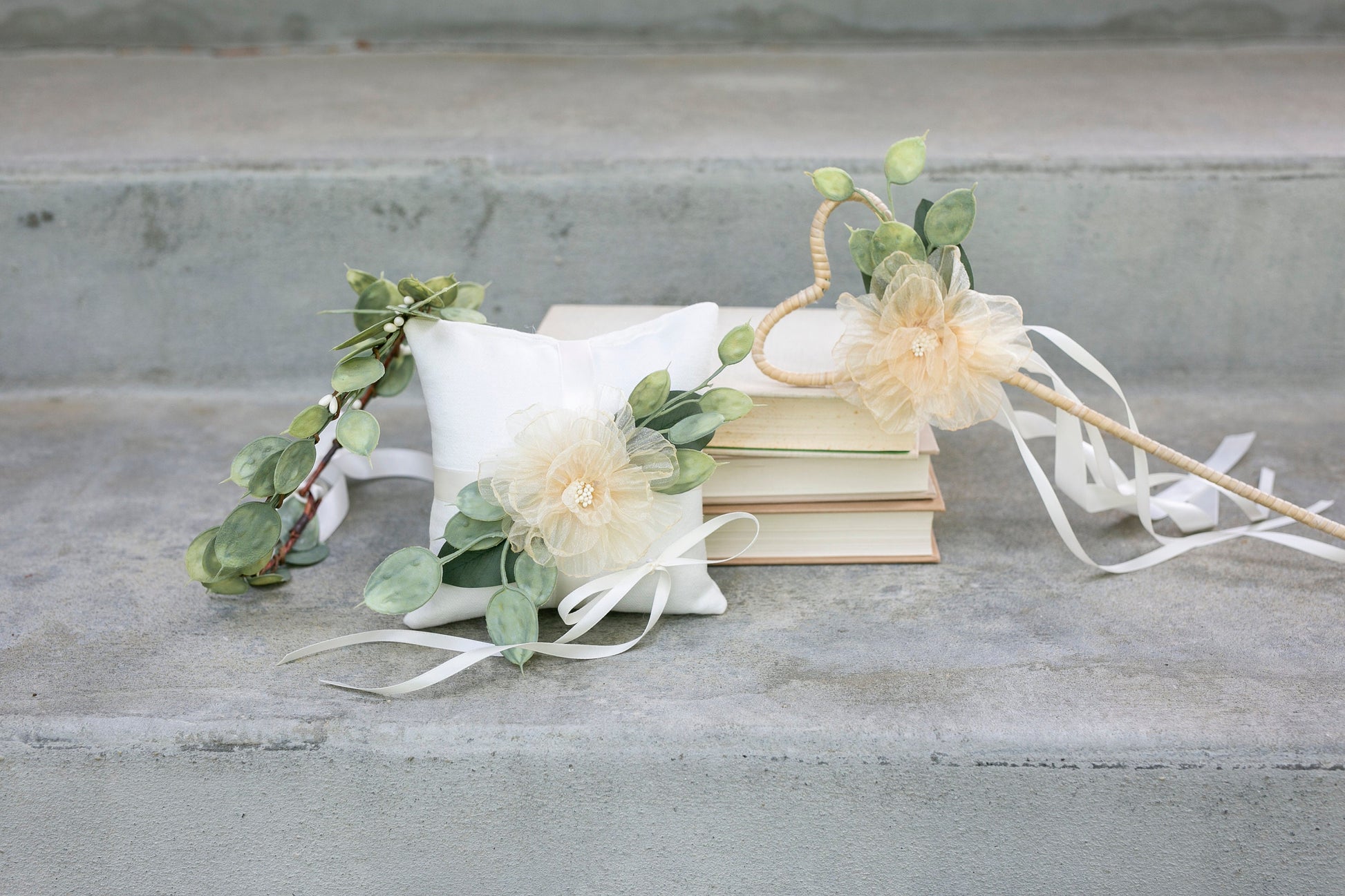 Our heart-shaped wands are wrapped in a creamy beige rattan and decorated with an artificial gold shimmer crinkle flower and whimsical greenery pieces. Wands are finished with beautiful satin ivory ribbon.