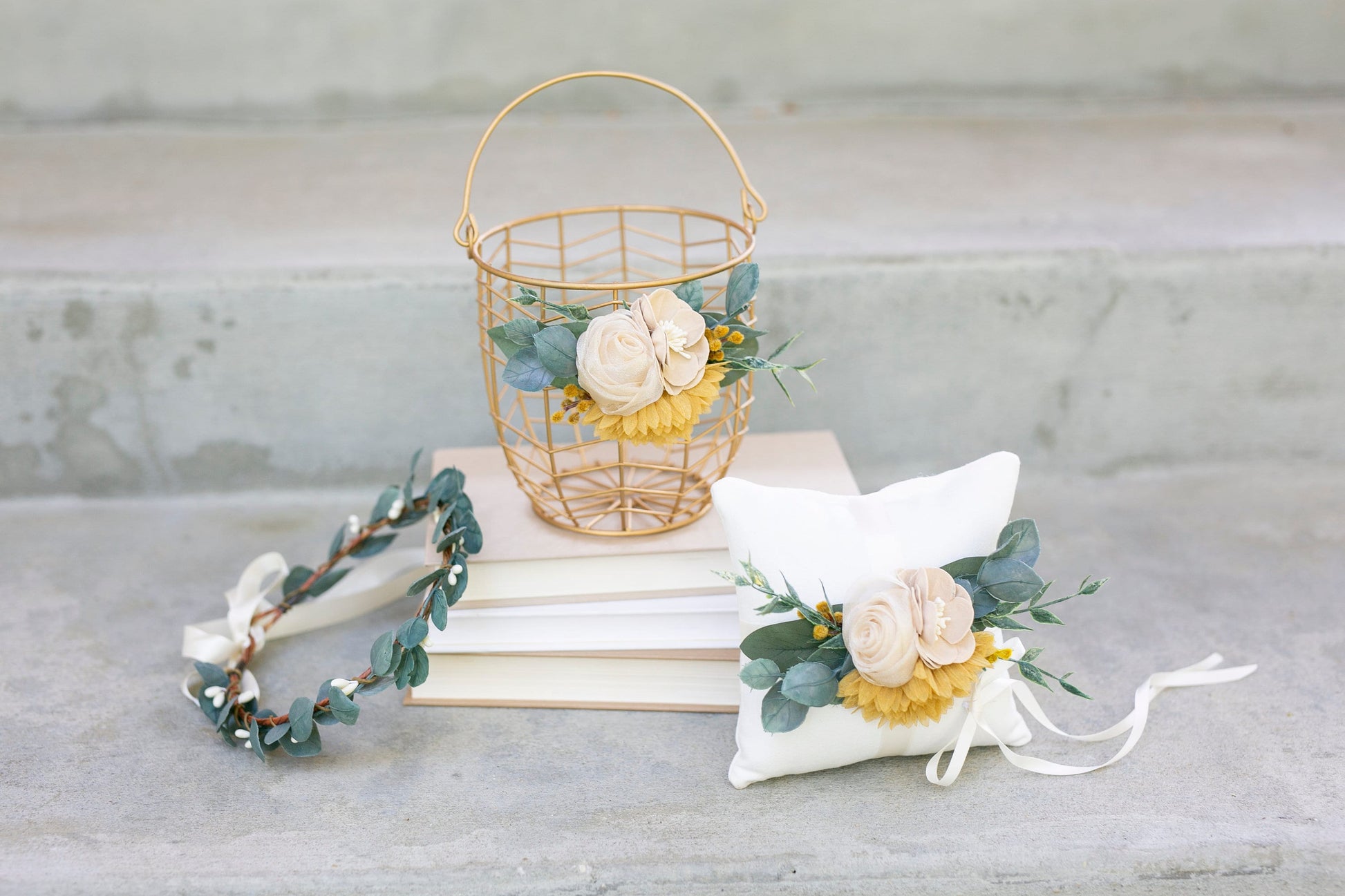 Flower Girl Basket Set | Beige, Yellow Tones on Gold Metal Wedding Basket | Flower Girl Gift