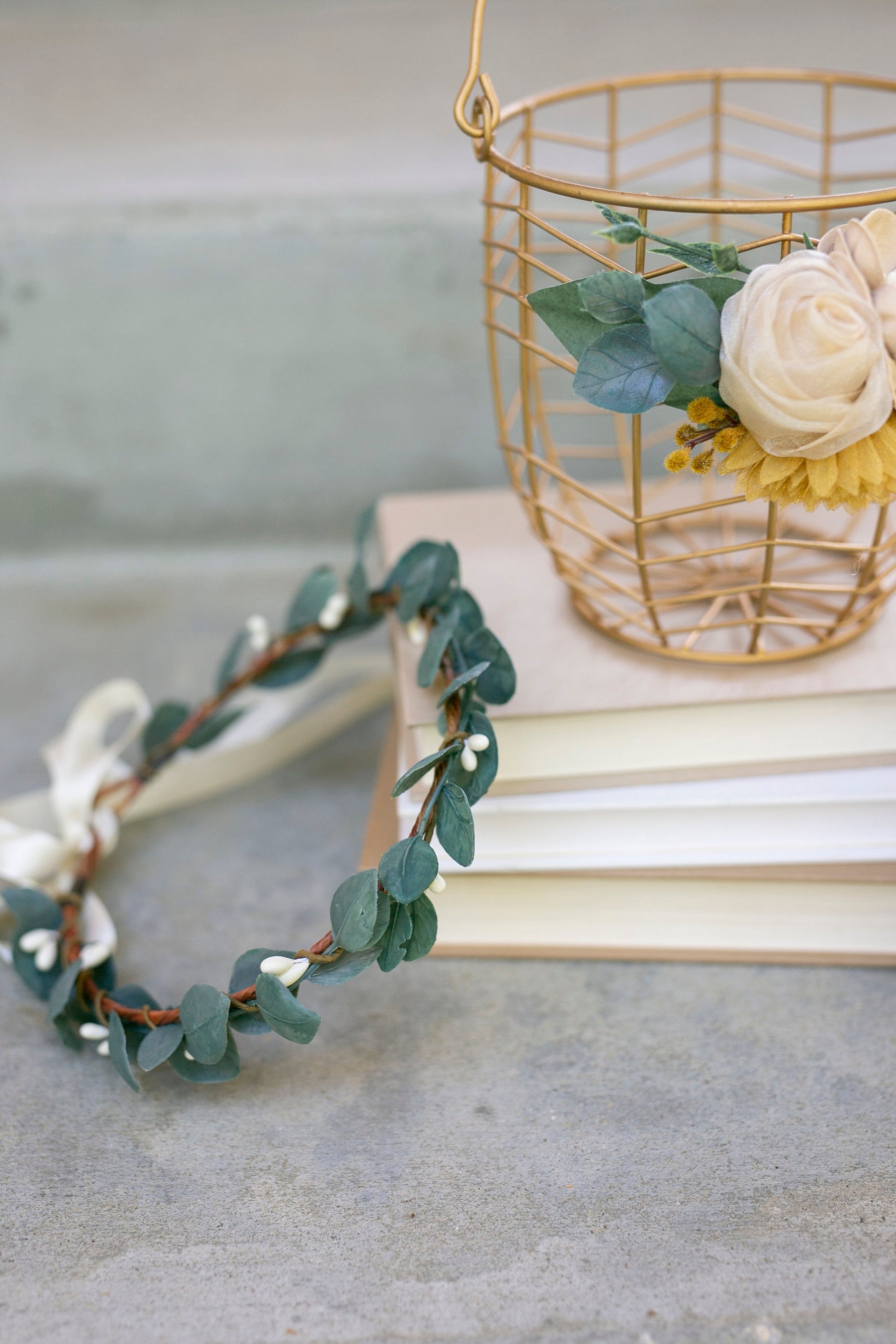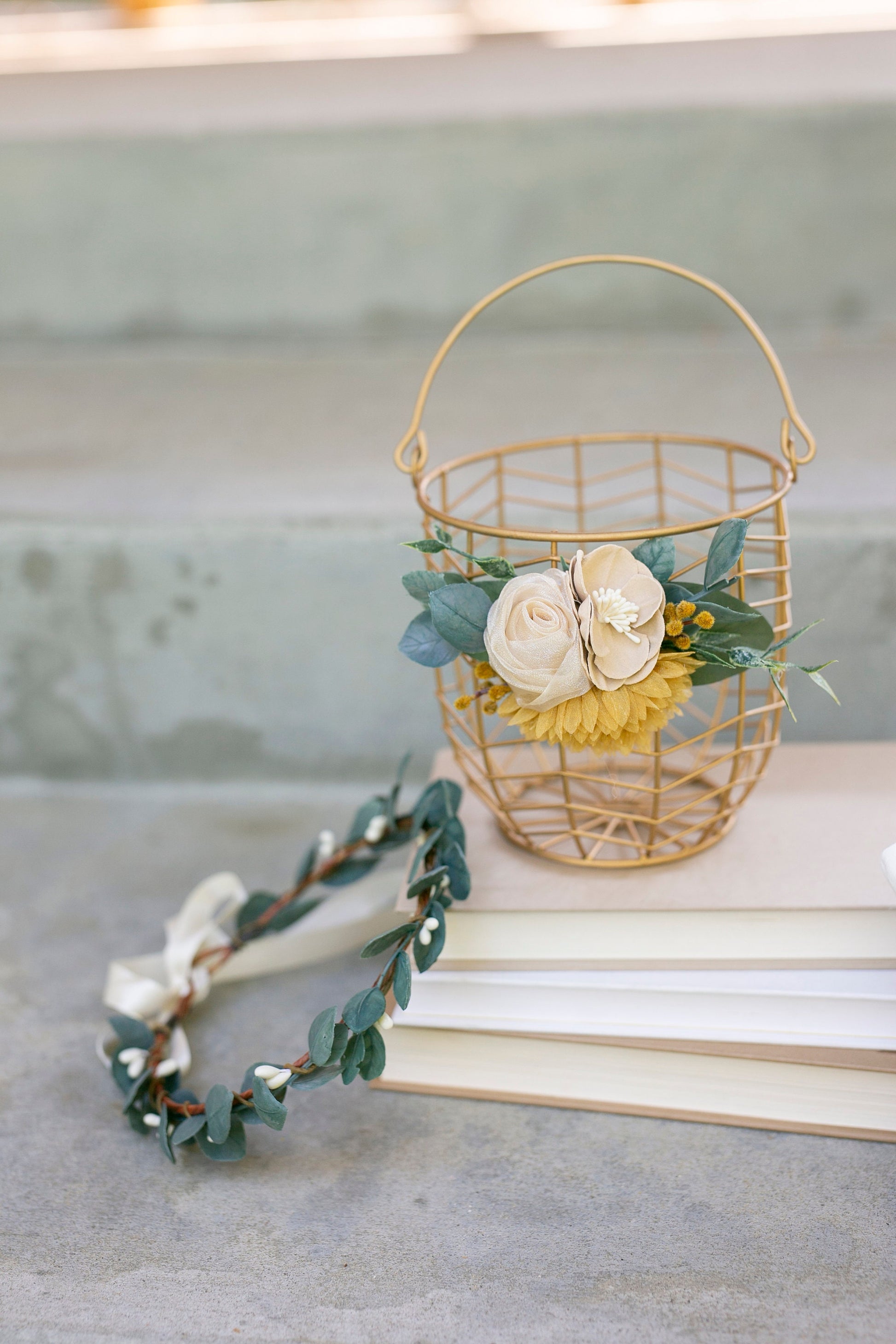 ♥ MEET Sunny On our Gold metal bucket-style flower girl basket, lush layers of artificial wedding greenery are paired with a cluster of handmade fabric flowers. In tones of beige, yellow gold, champagne, a romantic cluster of florals and cascading greenery creates a sweet accent for a variety of wedding color palettes.