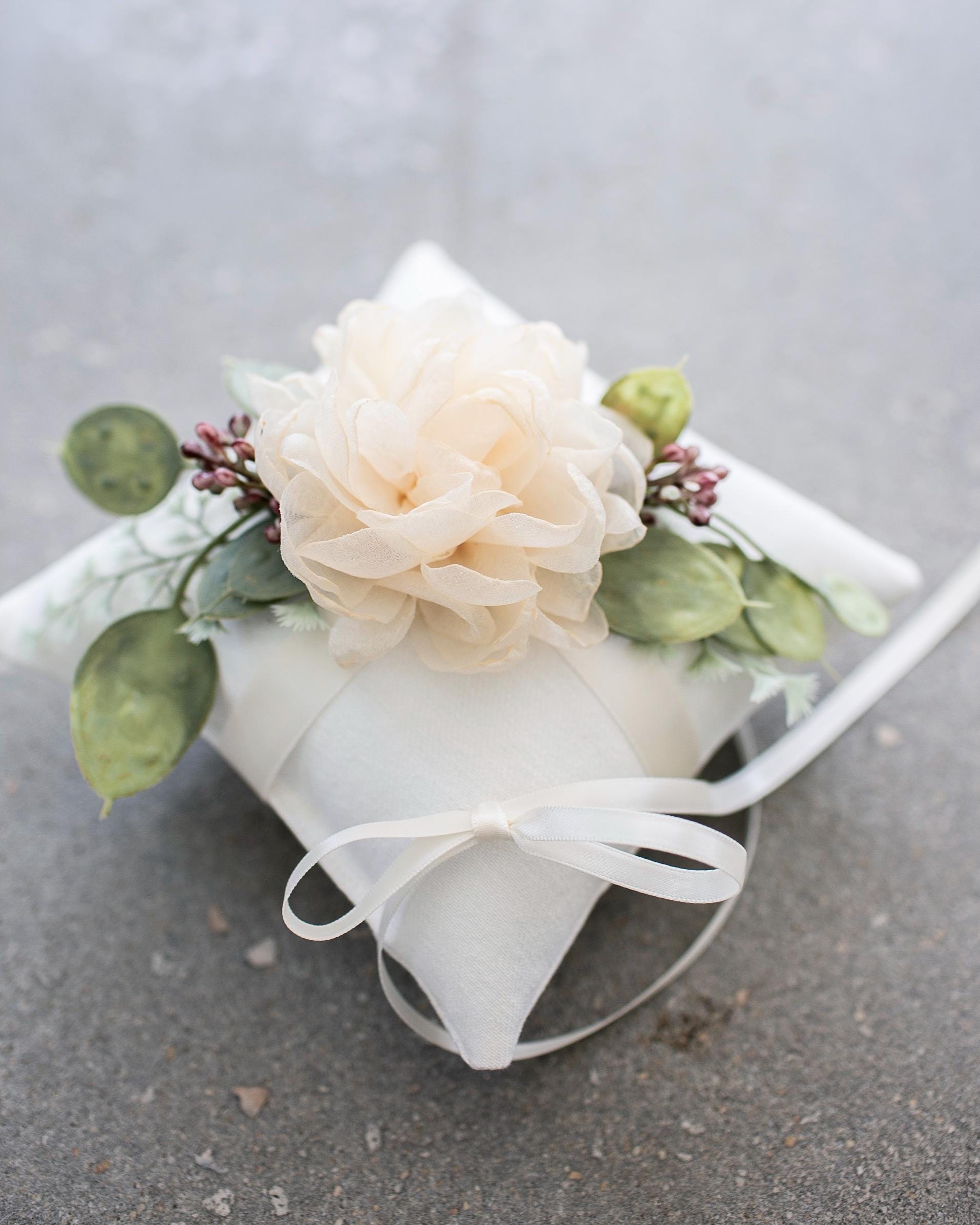 This handmade ring bearer pillow is decorated with cascading artificial eucalyptus and berries. An organza flower in a champagne ivory adds a sweet floral accent that perfectly complements the linen-look pillow and a variety of bridal bouquet styles.