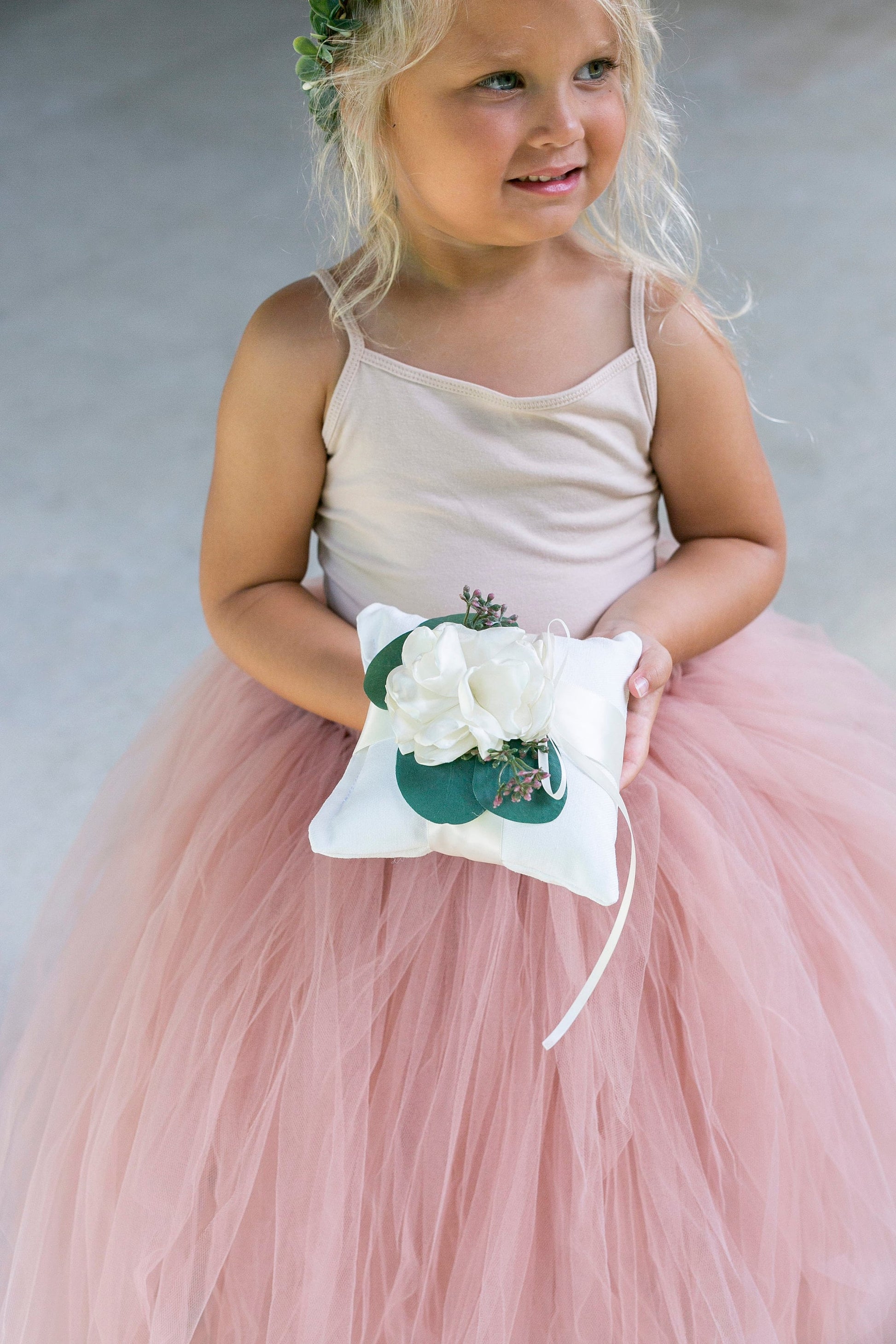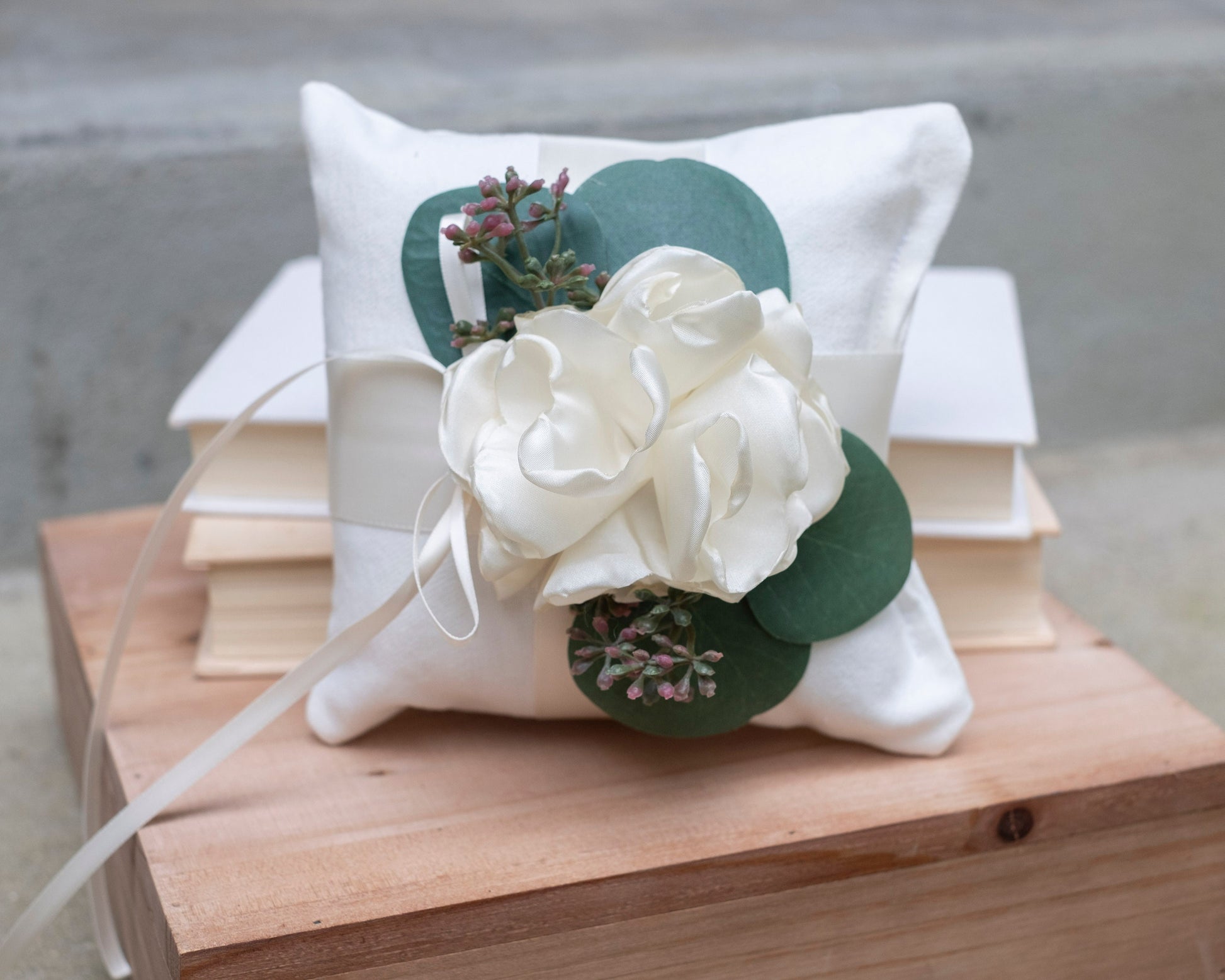 This handmade, linen-look ring bearer pillow is designed with silver dollar eucalyptus, a lush ivory fabric flower, and a satin ribbon for attaching rings. Our soft, durable linen-look material won't wrinkle during shipping!