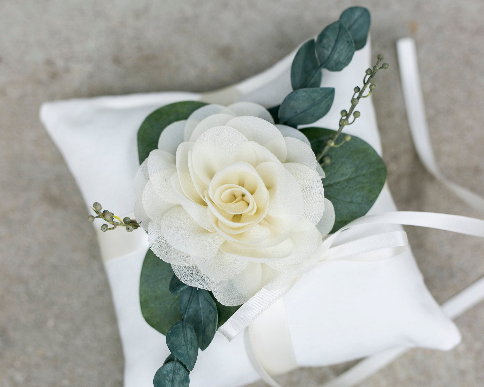 Handmade Linen-Look Ring Bearer Pillow: Ivory Rose & Eucalyptus
