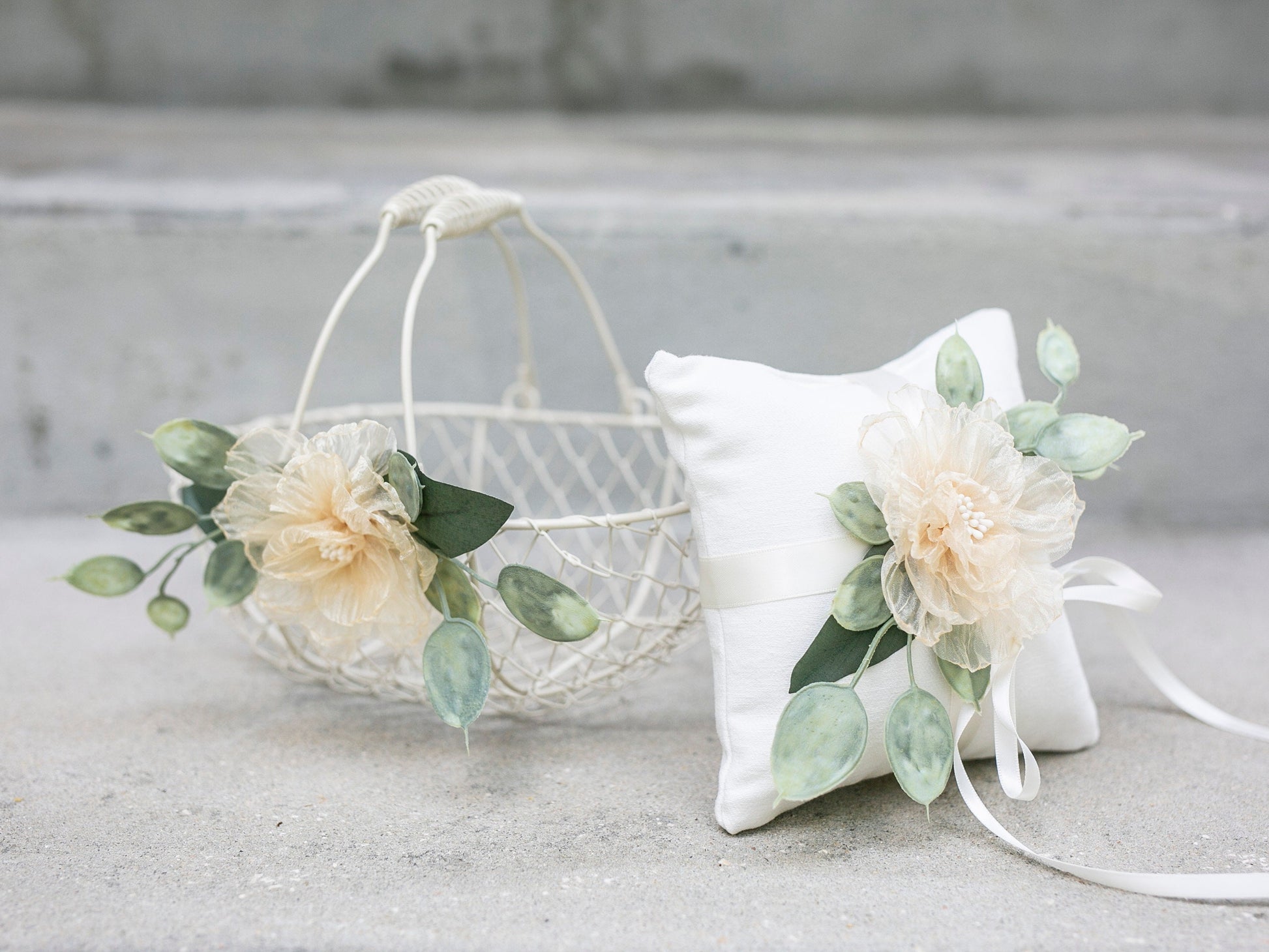 Ivory Flower Girl Basket and Ring Pillow Set: Boho Wedding Decor