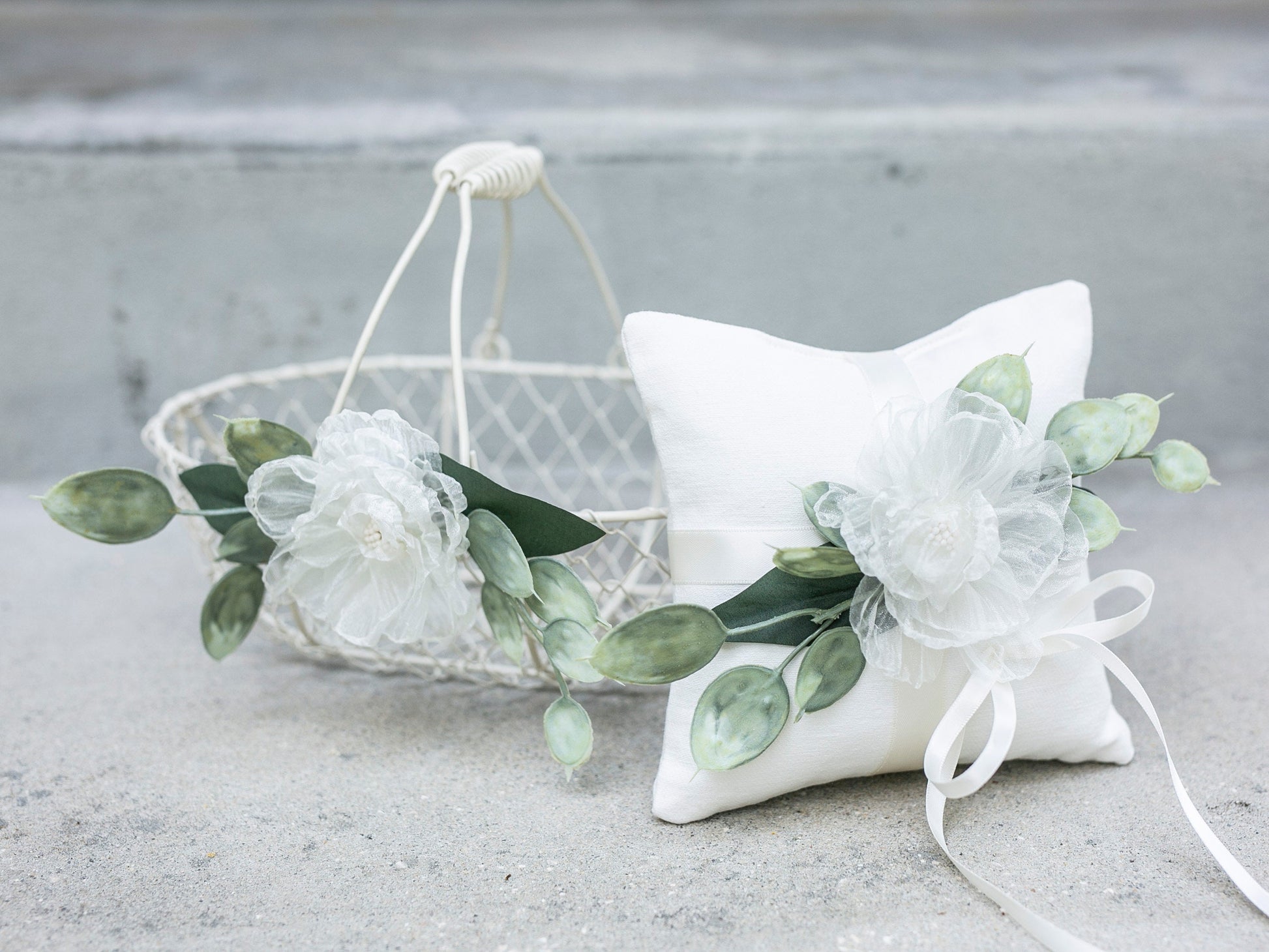 Lola is a darling bohemian flower girl basket decorated in lush artificial eucalyptus and accented with a handmade organza flower. This design comes in three sizes to accommodate flower girls of all ages. Our August ring bearer pillow is designed to match. The linen-look pillow suits a variety of wedding styles and is accented with greenery and a handmade rose. Satin ribbon is added to hold the rings in place.