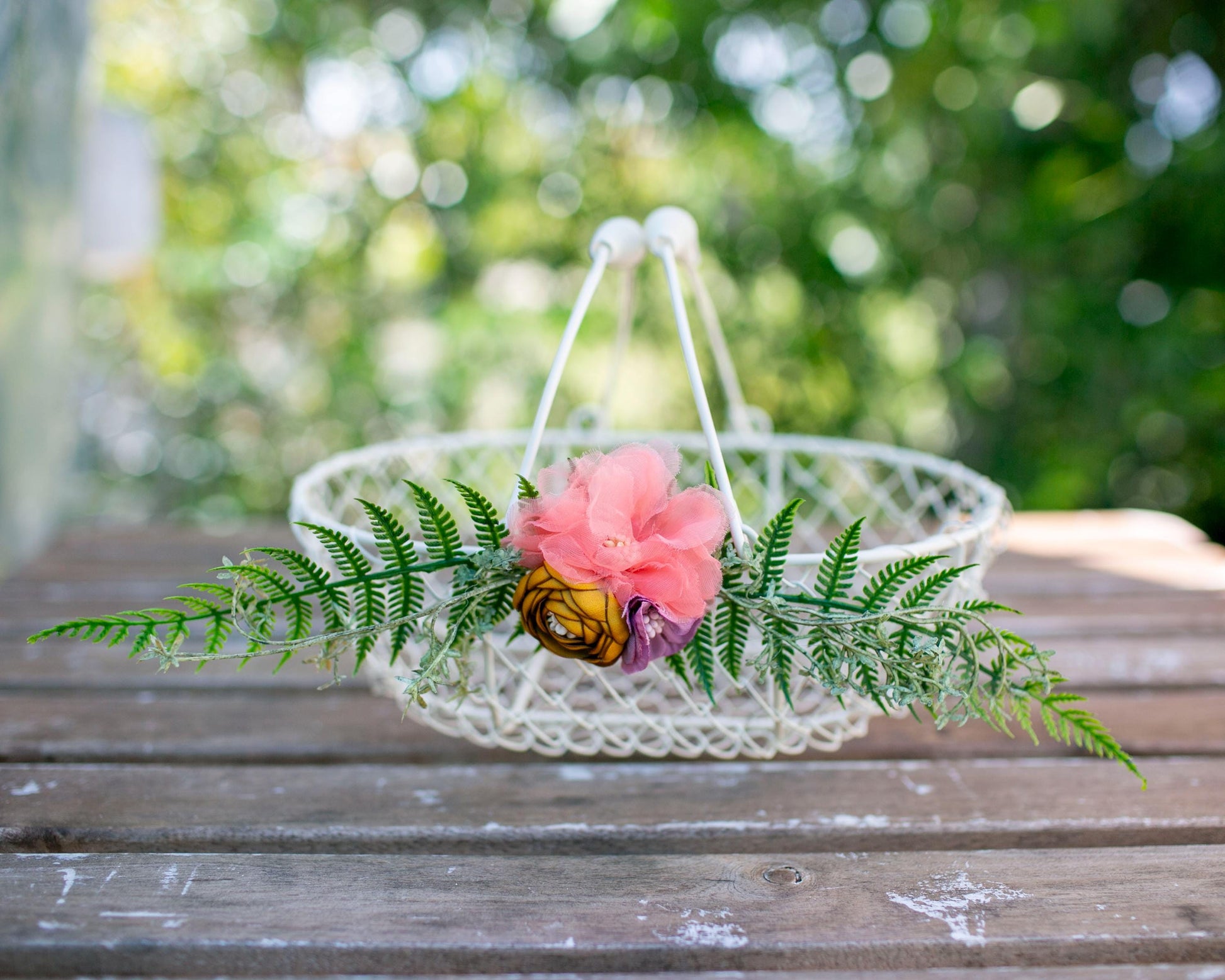 Ivory Wire Flower Girl Basket with a mix of Fabric Flowers