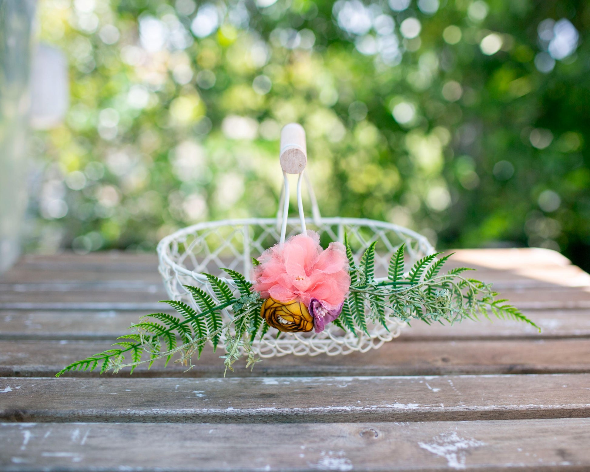 She is a darling wildflower girl basket decorated in lush artificial ferns and accented with a variety of handmade fabric flowers. This design comes in two sizes to accommodate flower girls of all ages. Our ring bearer pillow is designed to match. The linen-look pillow suits a variety of wedding styles and is accented with greenery and a handmade rose. Satin ribbon is added to hold the rings in place.
