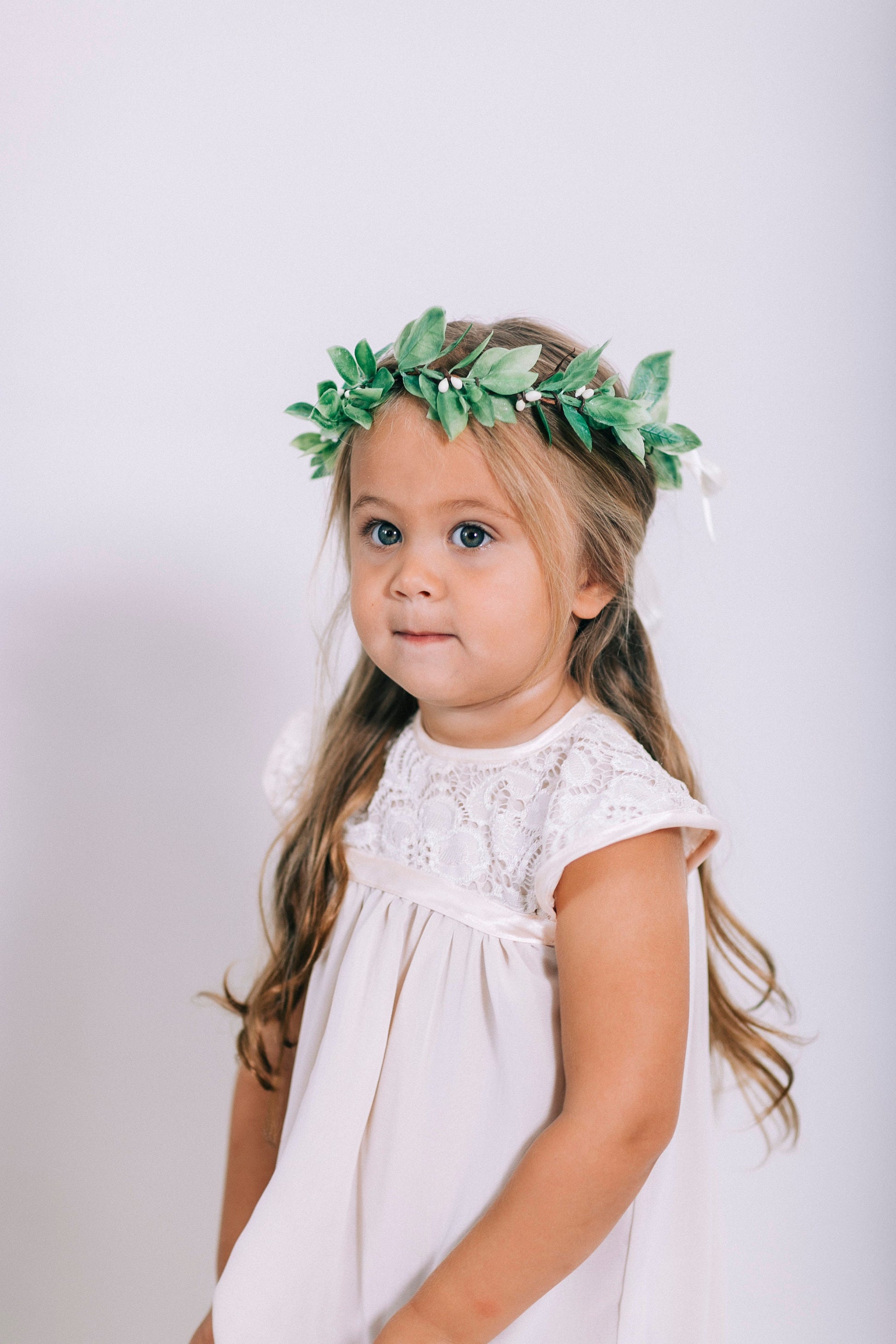 A cheerful & lush crown made of greenery, your flower girls and bridesmaids alike are sure to shine in this elegant floral hairpiece! Our Citron crown is made with faux lemon leaf greenery, attached to jute-wrapped wire, and finished with an ivory silk ribbon tie. The adjustable crown ties in the back with an ivory silk ribbon to adapt to any head size. Our Citron crown easily complements any wedding style with a hint of soft greenery.