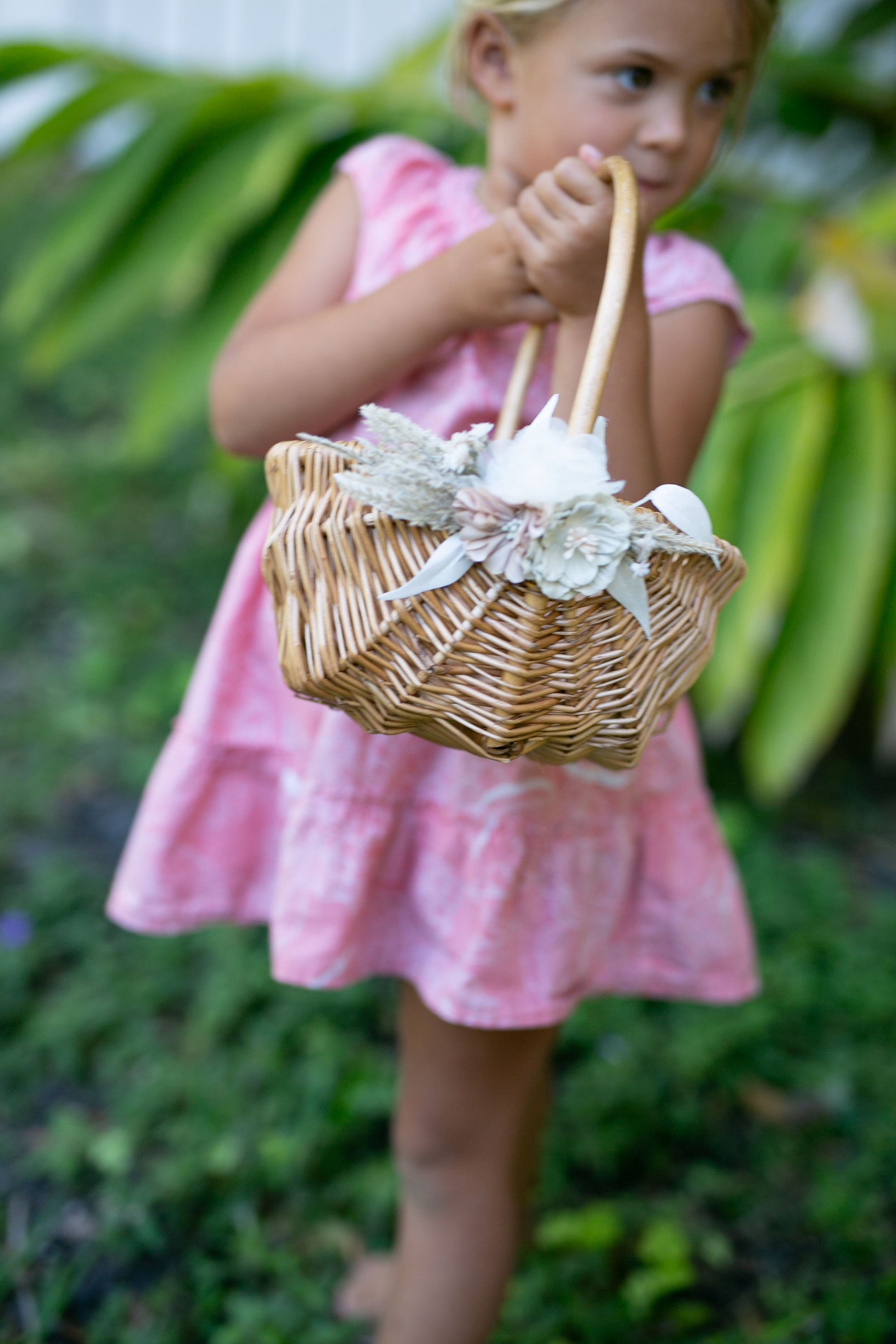 A desert-inspired, bohemian flower girl basket & matching accessories. 'Fleur' features neutral clusters of artificial blooms and grassy accents that easily pair with your wedding floral arrangements. She's easy to carry & perfectly sized for flower girls of all ages. An optional ring bearer pillow is designed to match. Pair with our whimsical bohemian crown for a complete look.