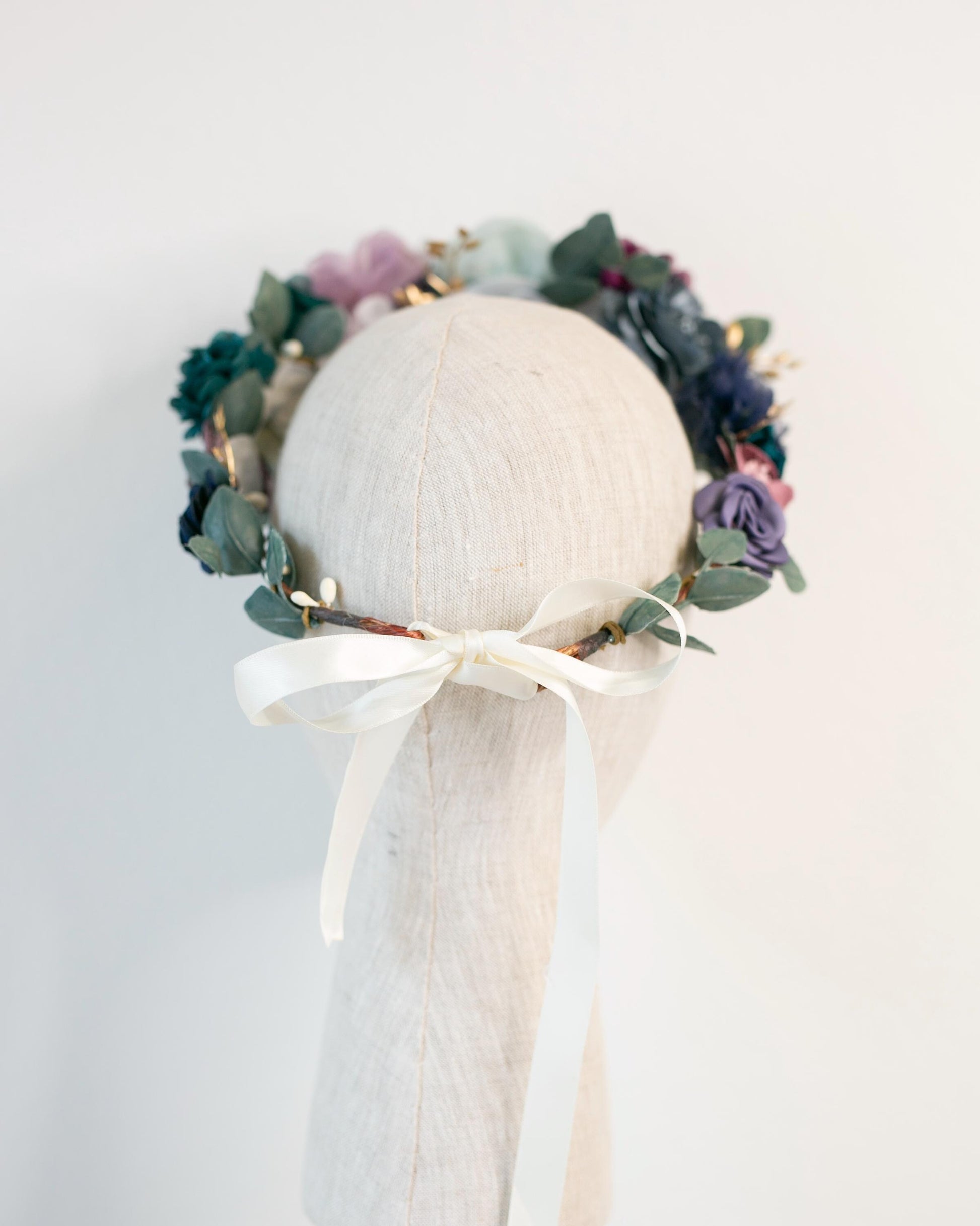 A fun accent to match your whimsy - the blues and purple crown is made with faux greenery, attached to jute-wrapped wire, and finished with an ivory silk ribbon tie. This floral crown beautifully adorns any bridal style with a fun mix of colors. The halo is versatile enough to wear day to day but is sure to stun on your wedding day. This piece won’t wilt away, but become a beloved part of your wedding day. Repurpose it for a photo shoot for the next stages in life...maternity photos, boudoir photos, family photos, or just for fun!