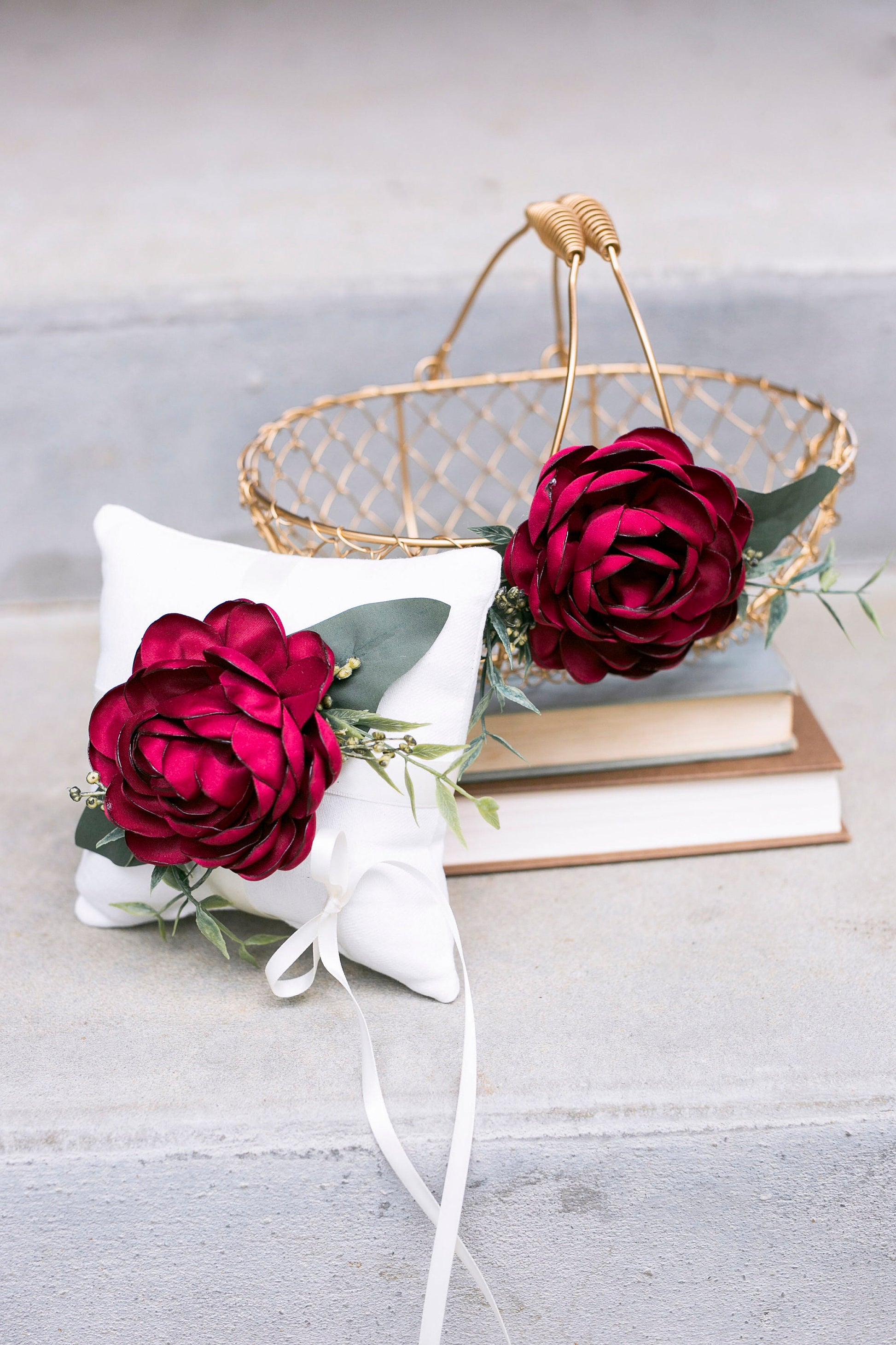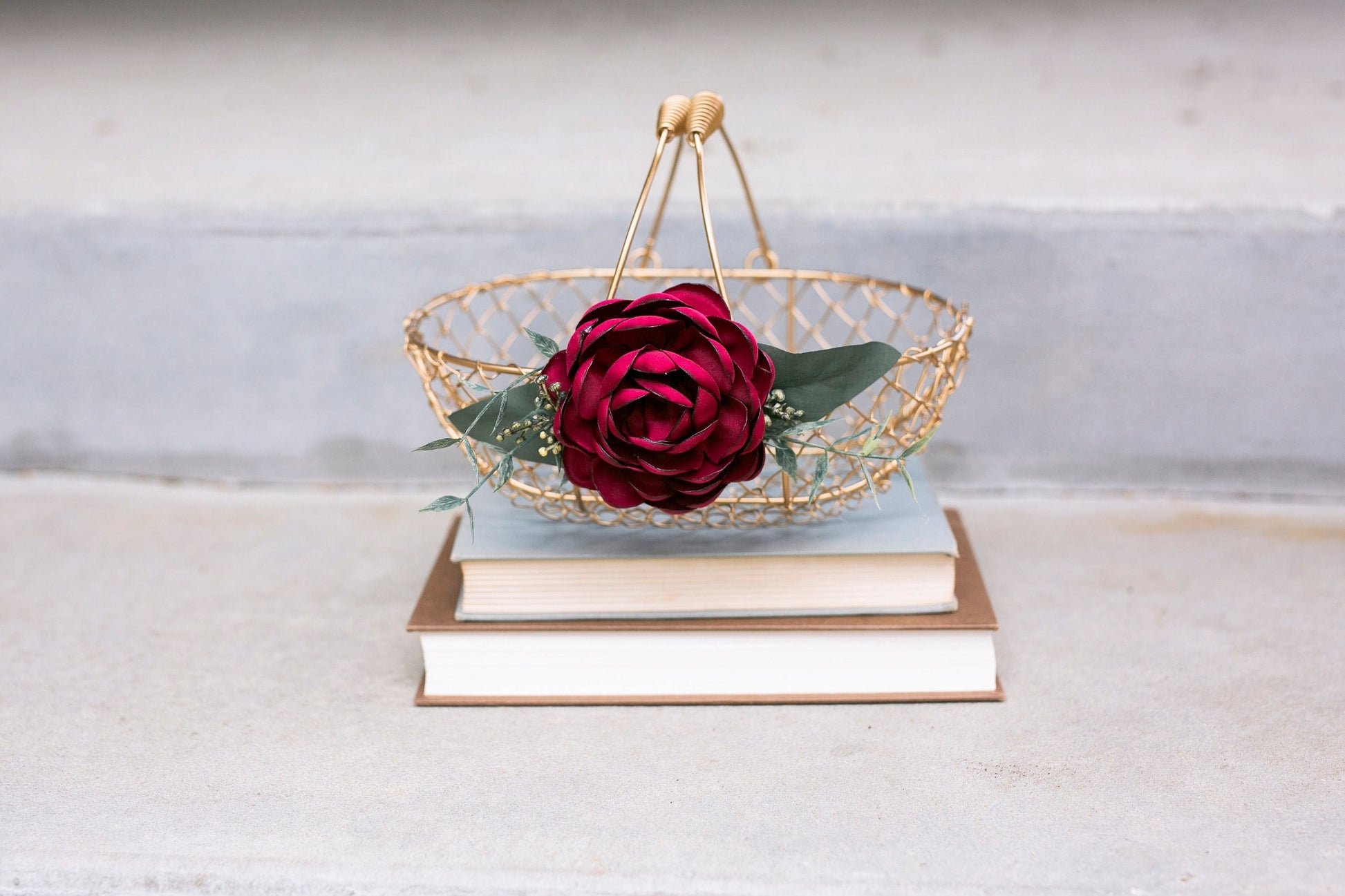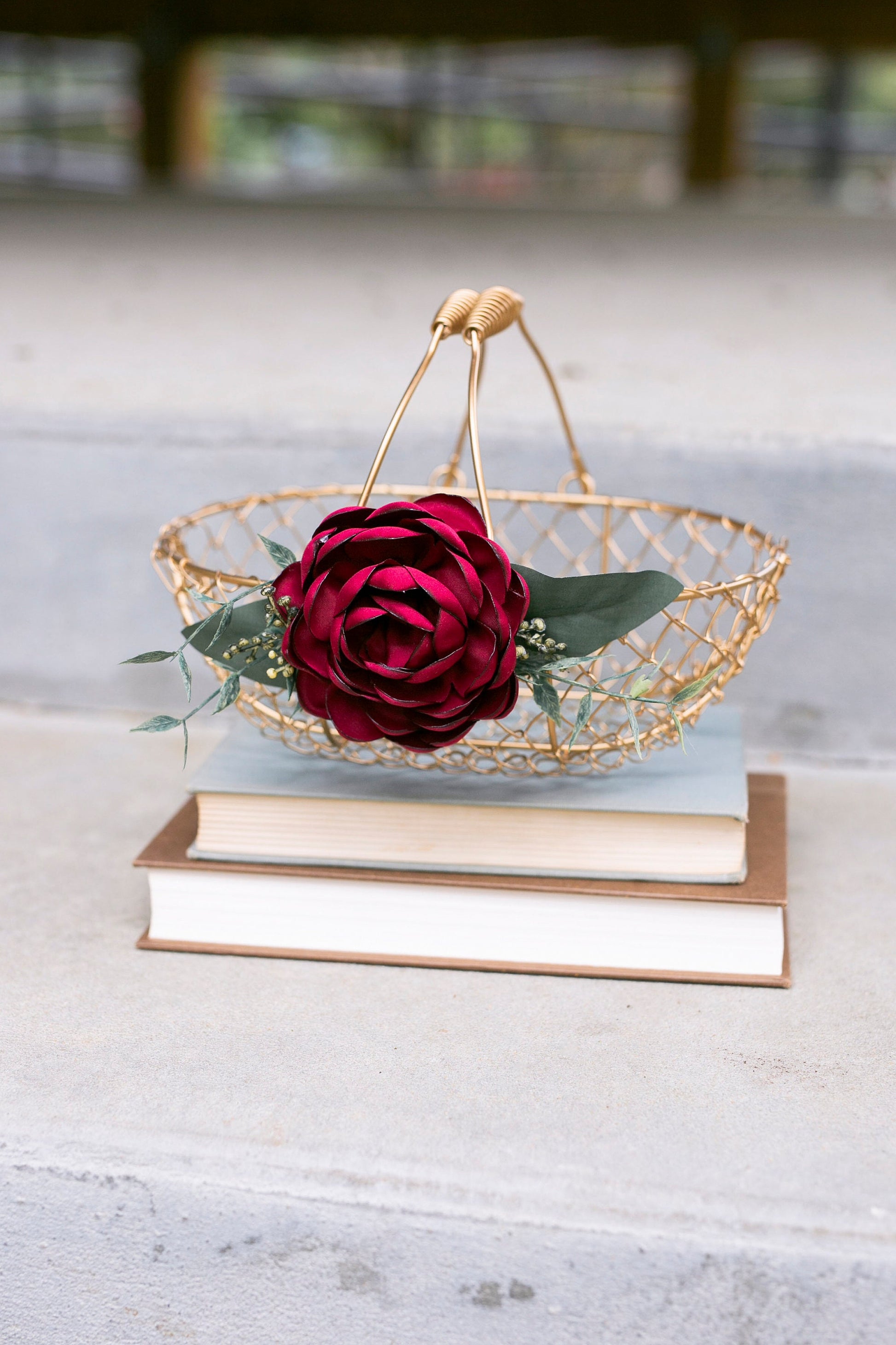 Romantic Crimson Red Floral Flower Girl Basket | Gold Wire Wedding Basket | Flower Girl Gift Set