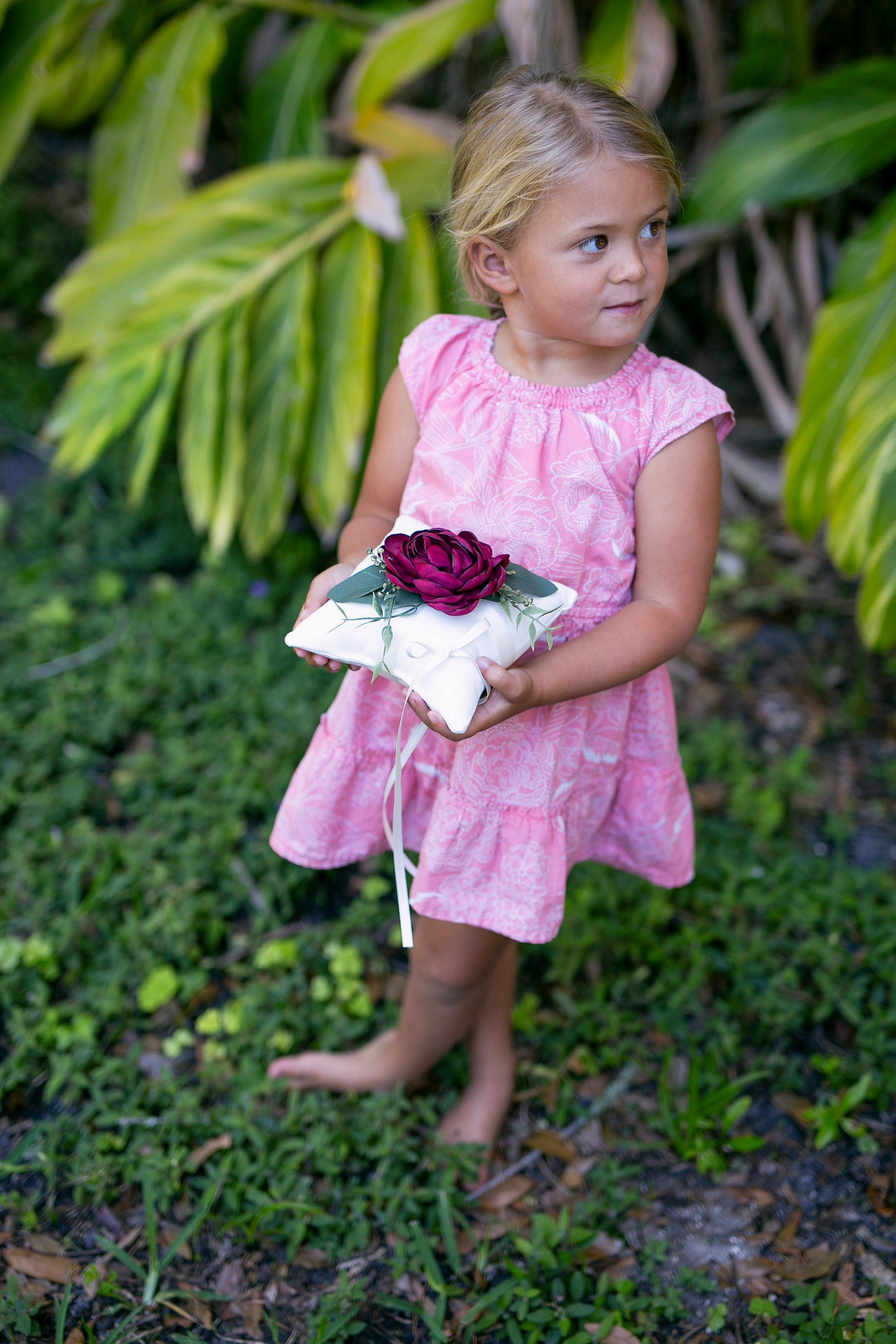 Belle is a darling romantic flower girl basket decorated in lush artificial greenery and accented with a handmade wine red fabric rose.