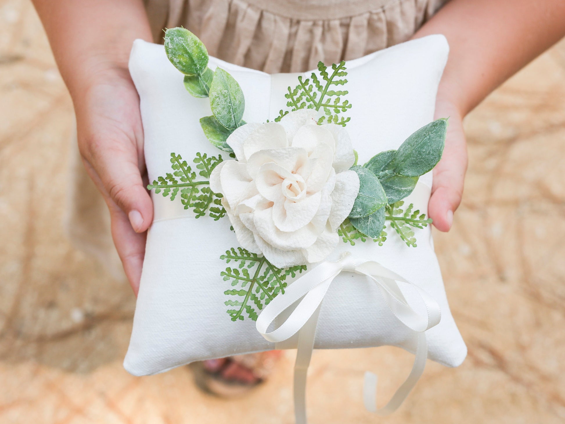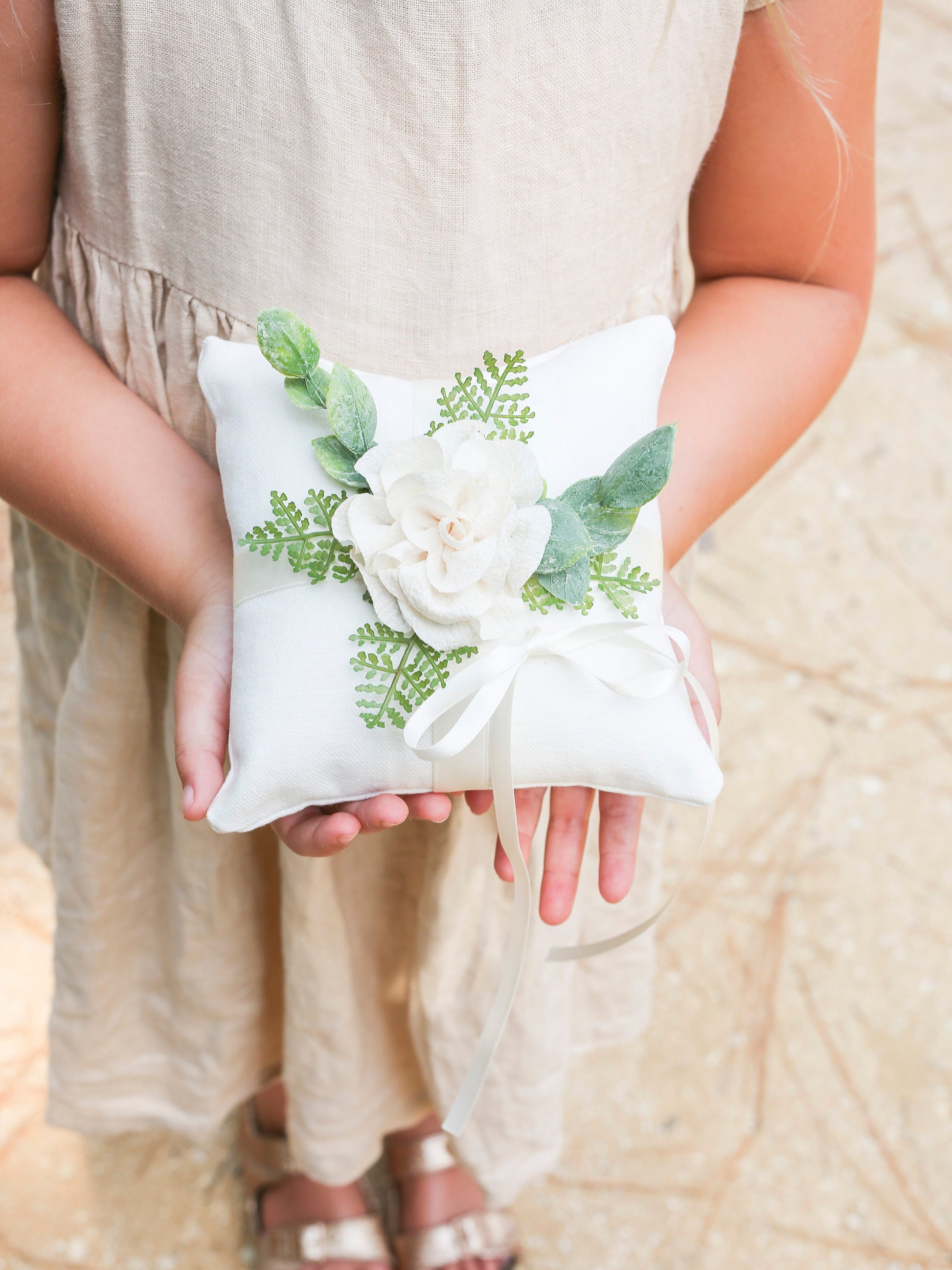 Our Silas ring bearer pillow is inspired by rustic weddings and timeless, neutral color palettes. The linen-look pillow suits a variety of wedding styles and is accented with faux eucalyptus, delicate fern, and a handmade fabric rose. Ivory satin ribbon is added to hold the rings in place.