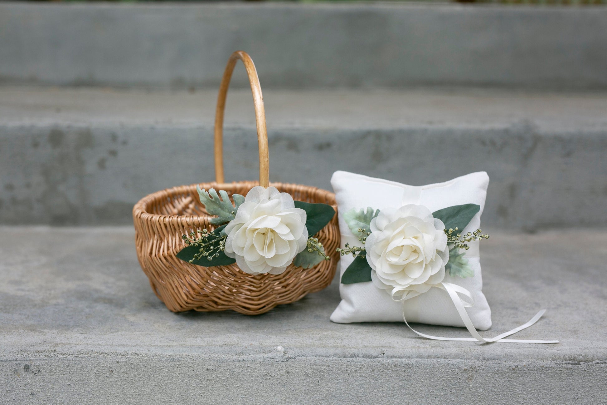 A handmade wicker flower girl basket in natural, peeled willow. Bristol features lush artificial greenery and is accented with a handmade chiffon fabric flower. Inspired by rustic weddings, she's perfect for flower girls of all ages. Our Parker ring bearer pillow is designed to match. The linen-look pillow suits a variety of wedding styles and is accented with greenery and a handmade chiffon rose. Pair with our whimsical Quinn greenery crown for a complete look.