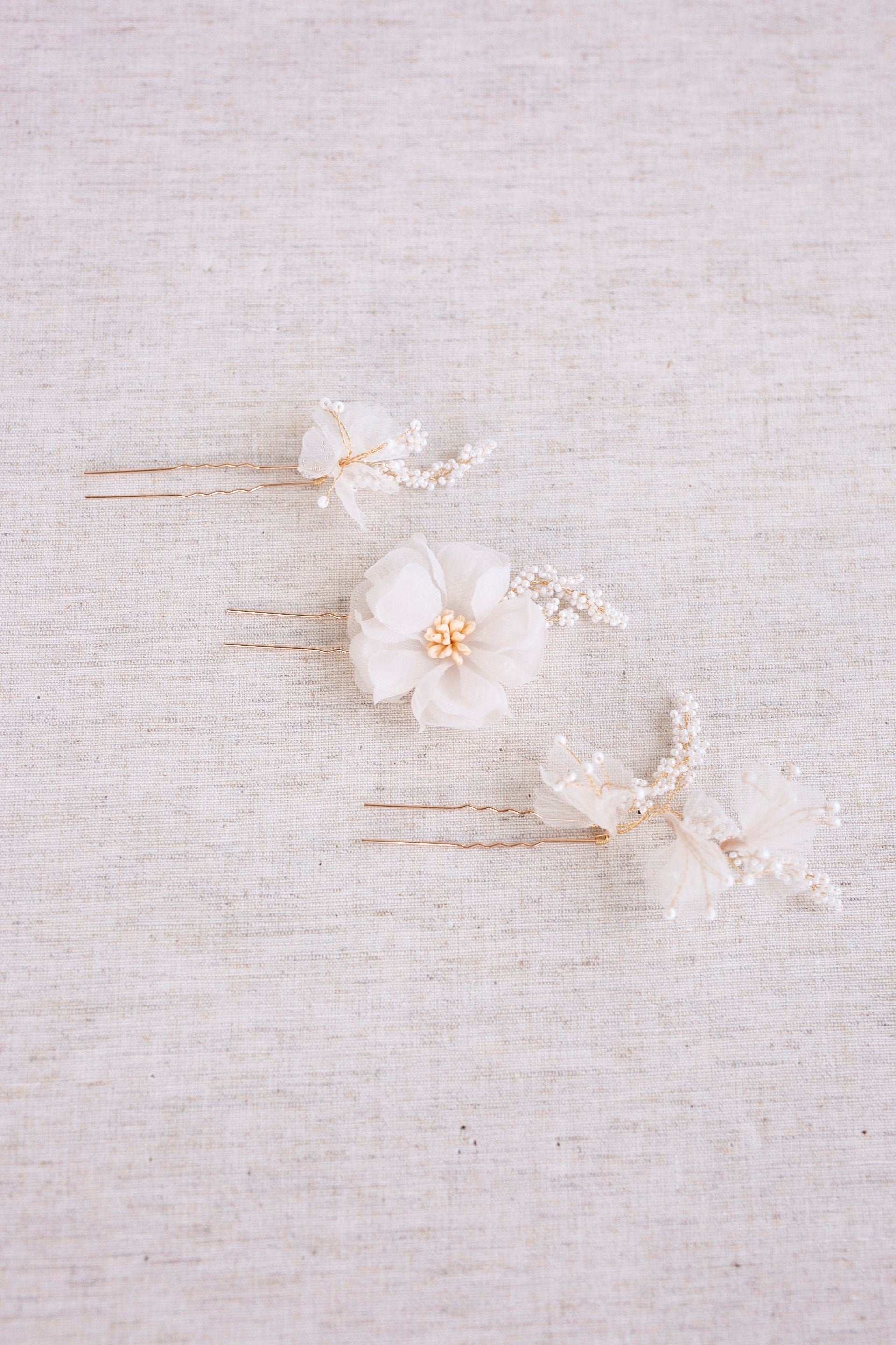 Meet the daintiest and most perfect bridal hair pin set ever. This luxurious set of three gold hair pins features dainty seed pearls and lush silk organza florals in pale blush pink.
