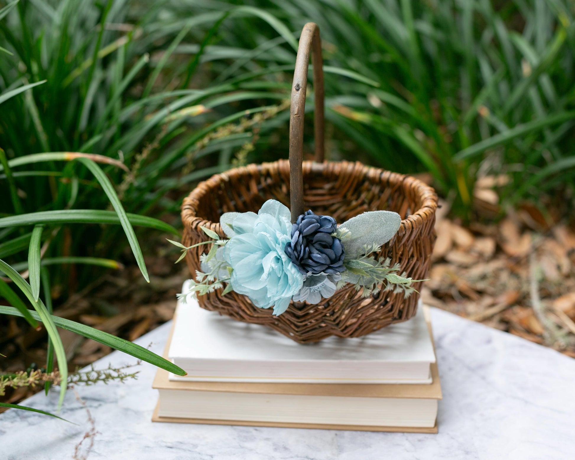 Wicker Flower Girl Basket: Handmade Willow Basket with Blue Floral Accents